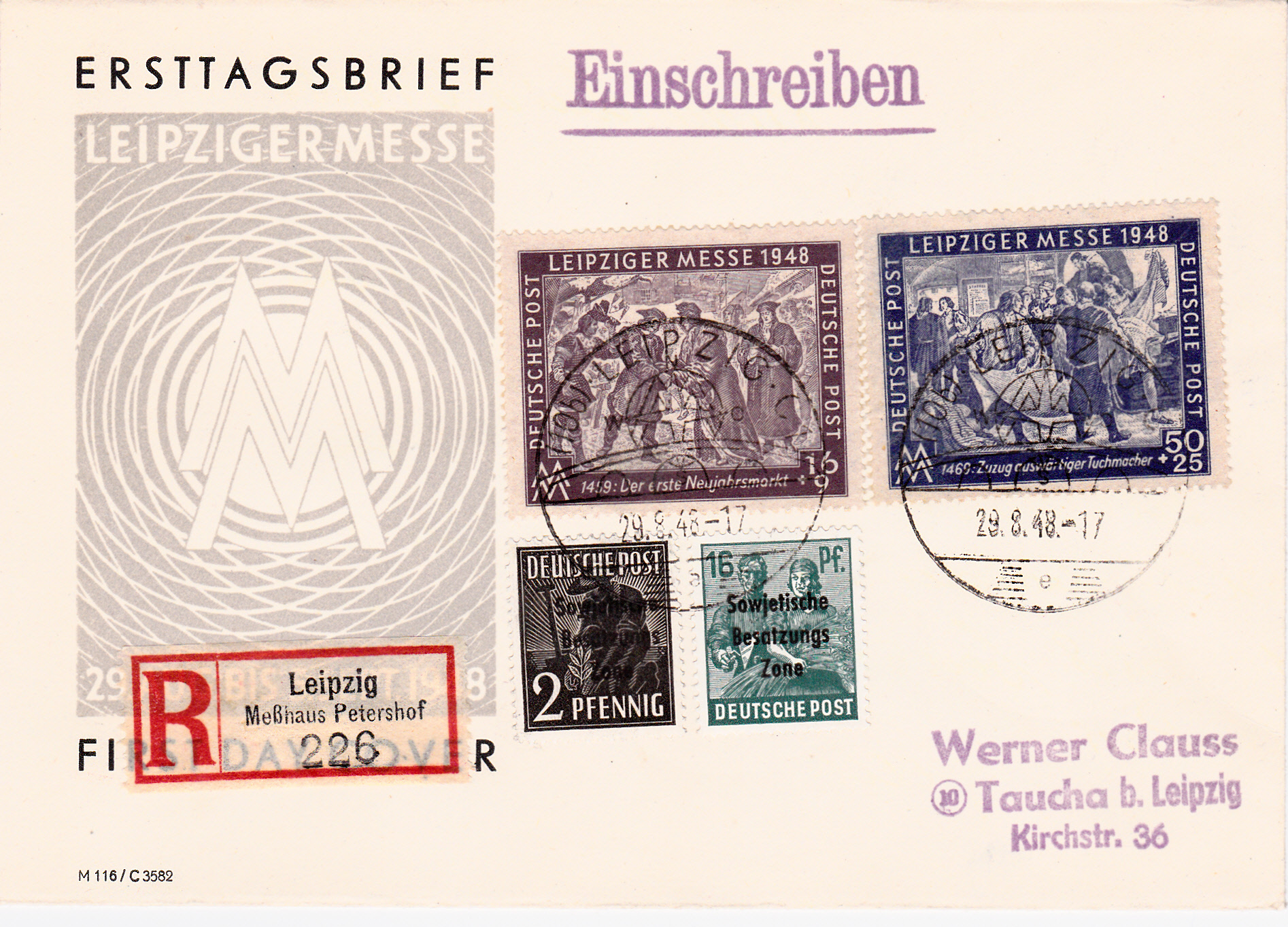 In der Sowjetischen Besatzungszone und der DDR kostete ein Standardbrief in der Zeit vom 1.3.1946 bis zum 30.9.1954 24Pf. Hier ein Brief per Einschreiben vom Ersttag (29.8.1948) der beiden Marken zur Leipziger Herbstmesse 1948 von Leipzig nach Taucha bei Leipzig. Das Porto betrug für den Brief 24Pf und die Sonderleistung Einschreiben 60Pf, zusammen also 84Pf. Auf dem Brief wurden neben den beiden Marken zur Leipziger Messe zu 16+9Pf (MiNr 198) und zu 50+25Pf (MiNr 199) nach je eine Marke zu 2Pf (MiNr182) und 16Pf (MiNr 188).
