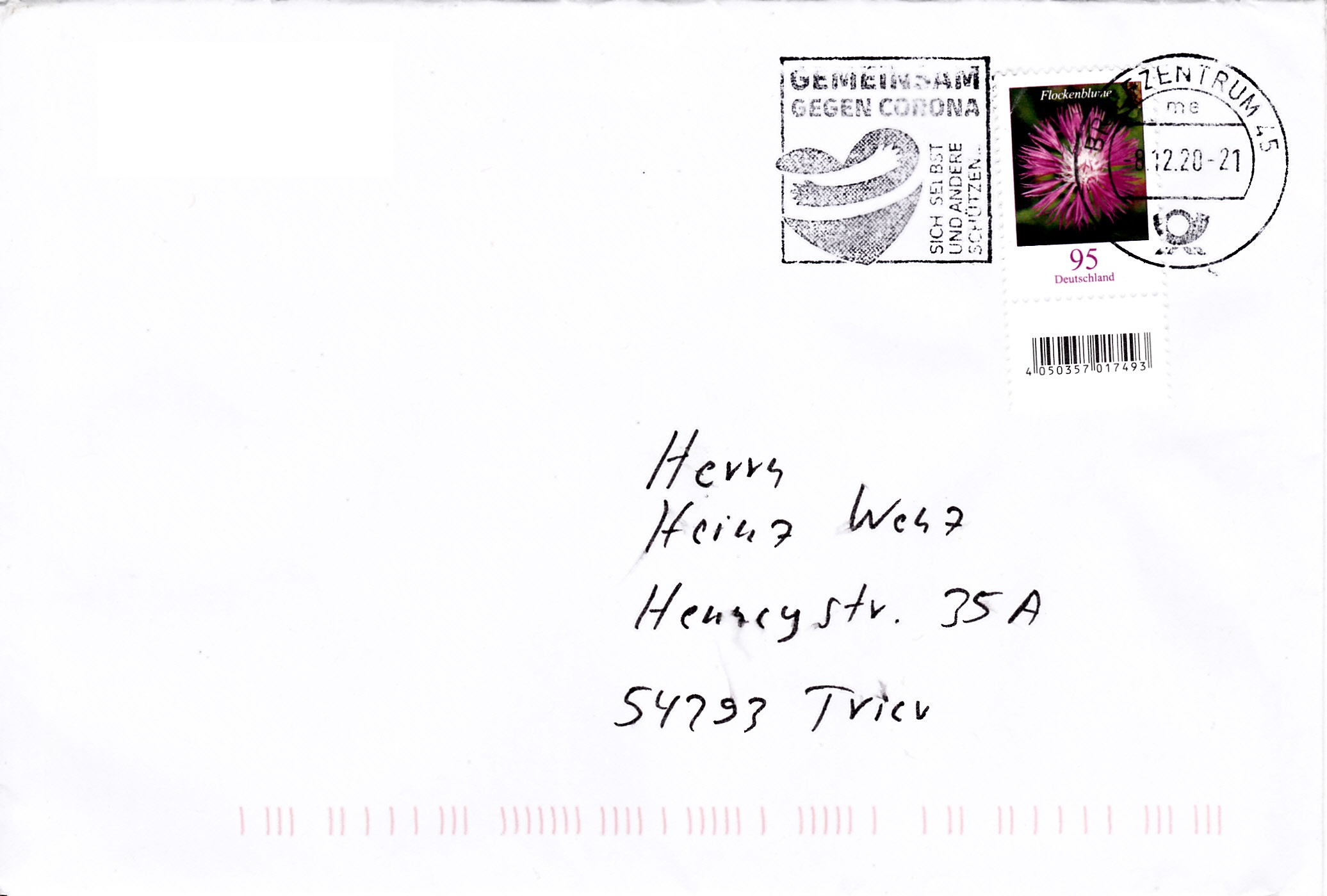 Dieser Brief von 21bis 50g im Standardformat mit Einwurfeinschreiben (Porto Brief 95 Cent, Einwurfeinschreiben 220 Cent, zusammen 315 Cent) wurde am 12.2.2021 in einem Briefzentrum mit einem Stempel in blauer Farbe gestempelt. Die blaue Stempelfarbe ist beim Scan auf dem weißen Hintergrund der Jugendmarke kaum zu erkennen (im Original ist der Stempel dort lesbar).