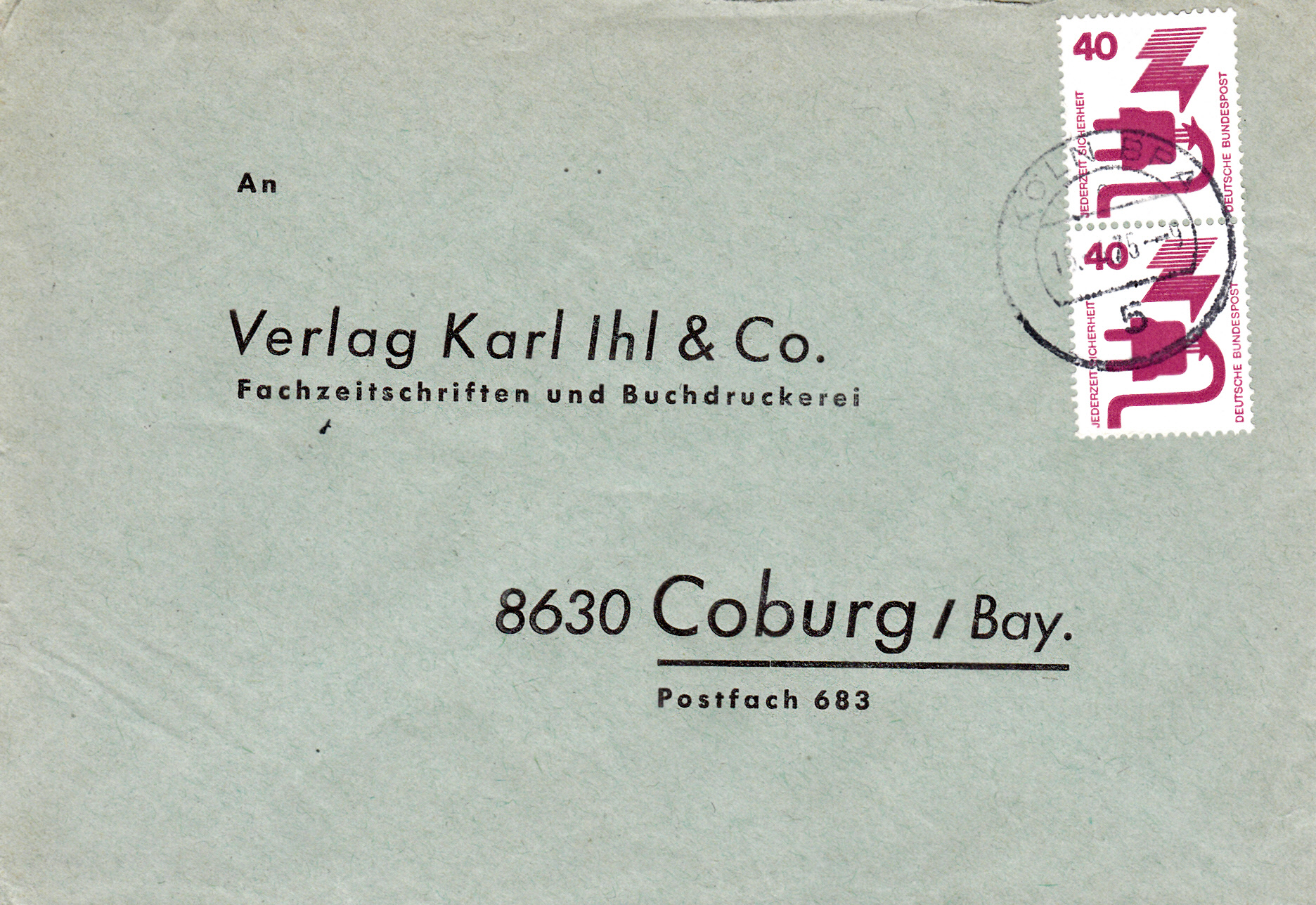 Es folgt ein weiterer Brief mit Wertangabe, hier nun 500DM, von Althengstett nach Berlin. Er kostete wie im Beitrag vorher bereits berechnet, ebenfalls 280Pf. Dieser Brief wurde mit zwei Marken zu Einweihung des Palais de l'Europe in Straßburg (MiNr 921) zu je 140Pf frankiert.