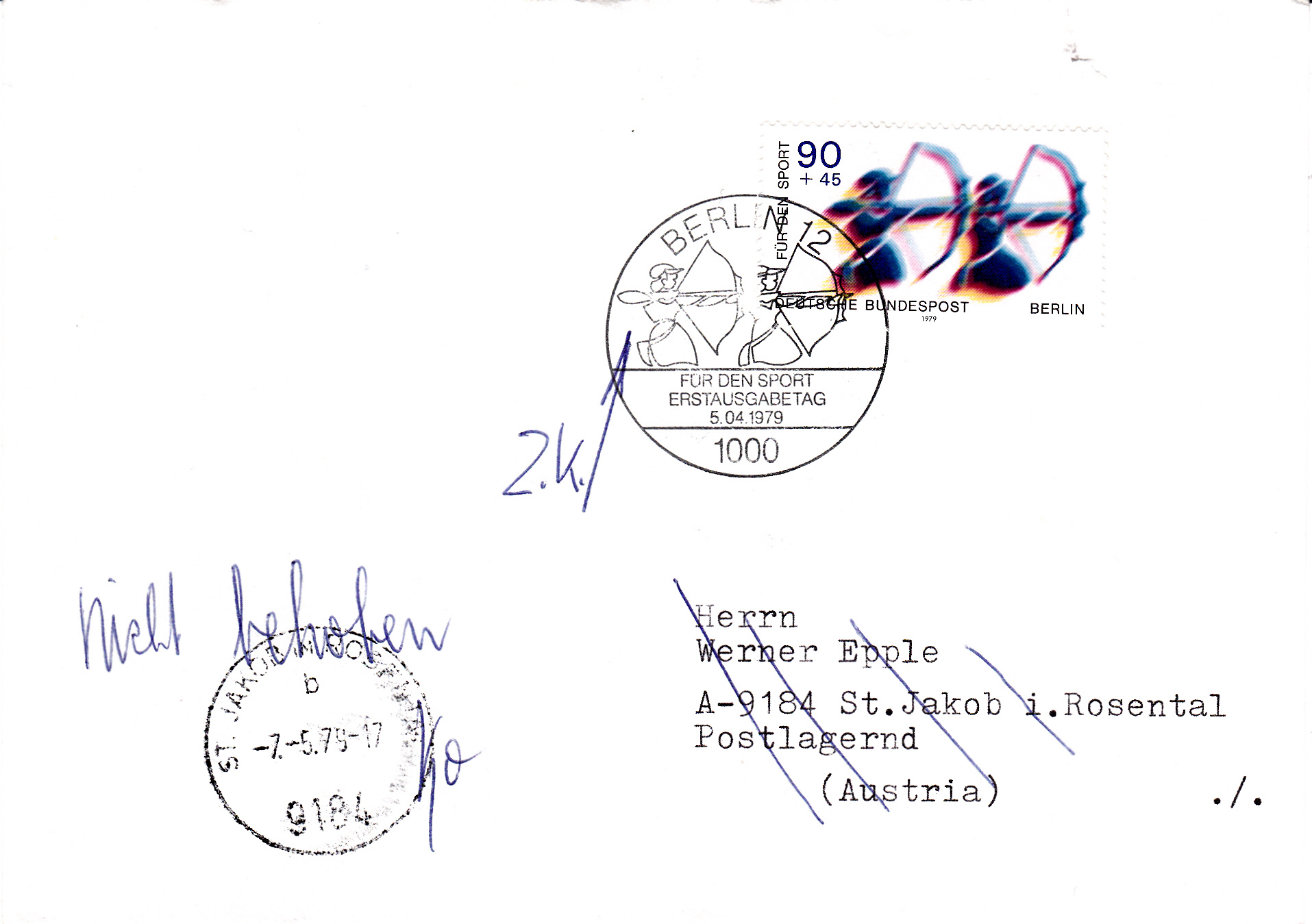 Dieser Brief wurde am 5.4.1979 von Berlin nach St. Jakob (Österreich) postlagernd verschickt. Da er dort nicht abgeholt wurde, trar er am 7.5.79 wieder die Rückreise an.