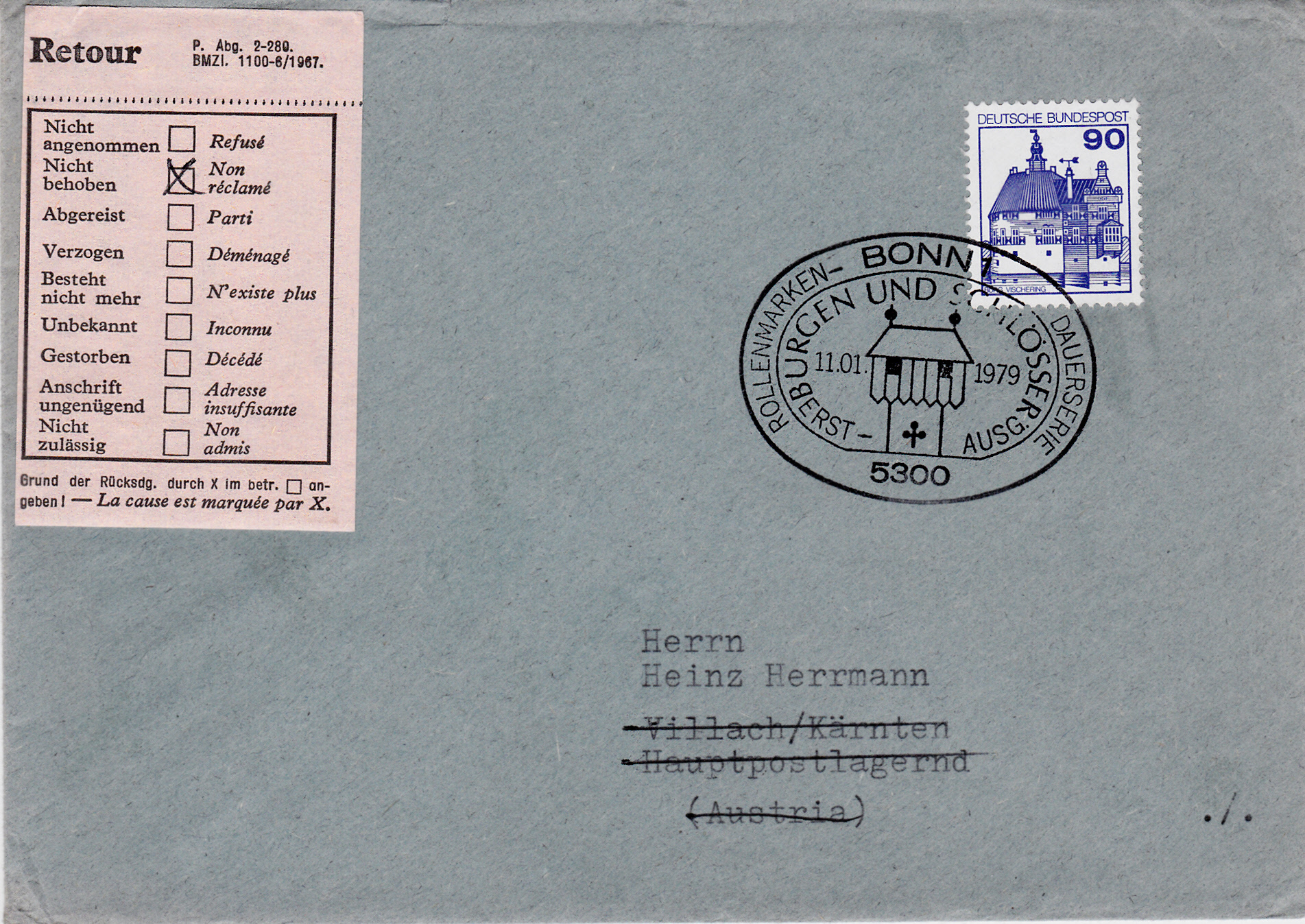 Dieser Brief wurde am 11.1.1979 von Bonn nach Villach (Österreich) postlagernd verschickt. Da er dort nicht abgeholt wurde, erfolgte die Rücksendung am 21.1.79 (Rückseitiger Stempel).