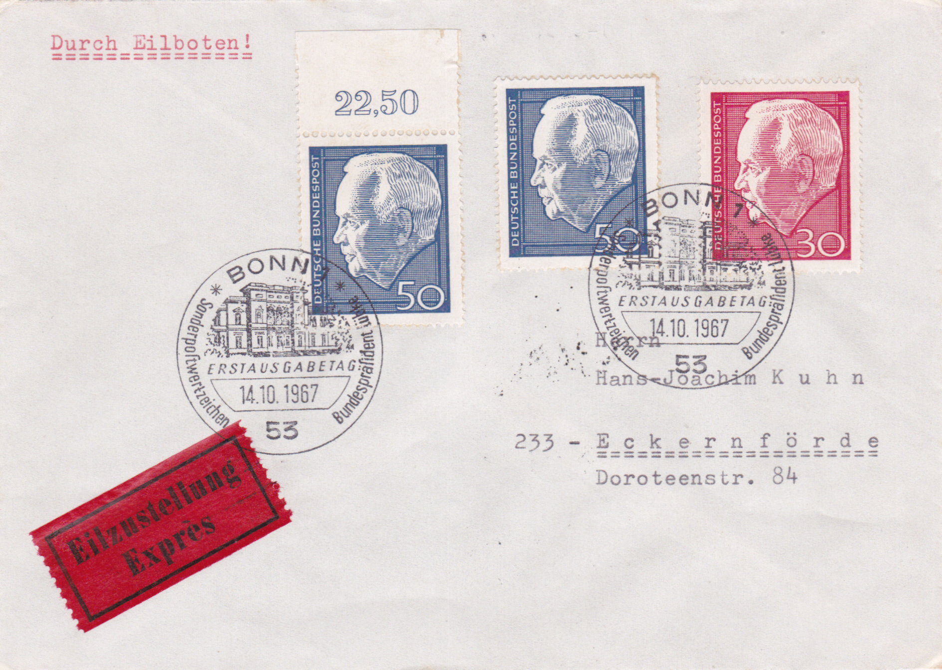 Es folgt ein Brief vom 31.1.1972. Er wurde mit Einschreiben innerhalb von Braunfels verschickt. Das Briefporto betrug bis 20g ebenfalls 30Pf. Die Zusatzleistung Einschreiben war am 1.9.1971 auf 100Pf gestiegen, so dass bei diesem Brief das Gesamtporto 130Pf betrug. Zur Frankatur wurden zwei Marken der DS Heinemann verwendet (MiNr 640 und 642)