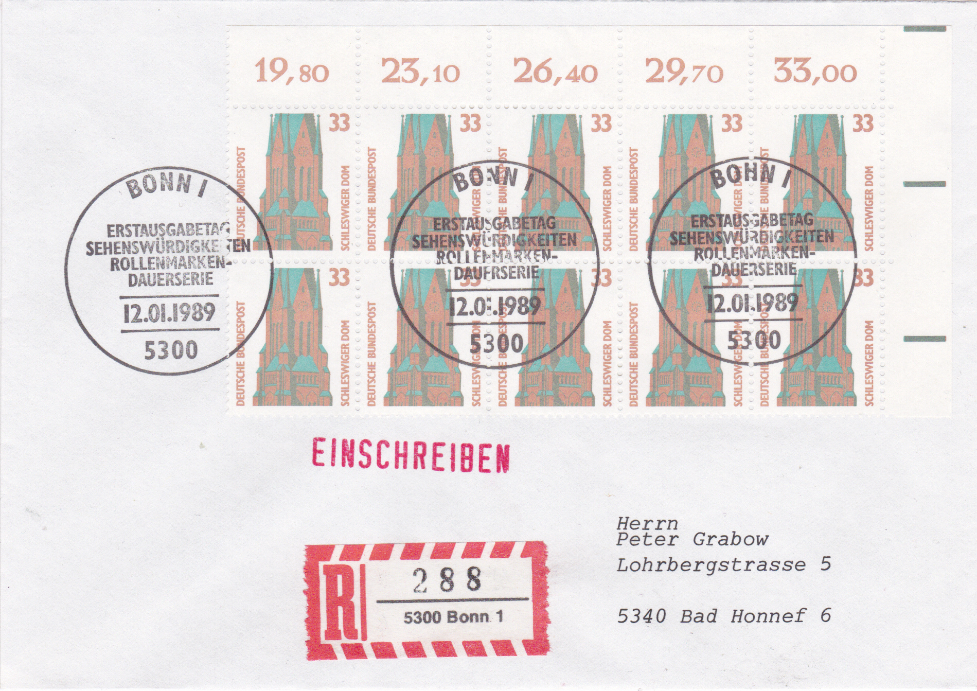 Dieser Brief bis 50g wurde am 12.1.1989 mit Einschreiben von Bonn nach Bad Honnef befördert. Frankiert ist er mit einem Zehnerblock der Marke zu 33Pf mit dem Motiv "Dom, Schleswig" vom rechten oberen Bogenrand. Die Marken sind mit dem Ersttagsonderstempel Bonn gestempelt. Das Porto betrug: Inlandsbrief 20 bis 50g 130Pf, Einschreiben 200Pf, zusammen 330Pf.