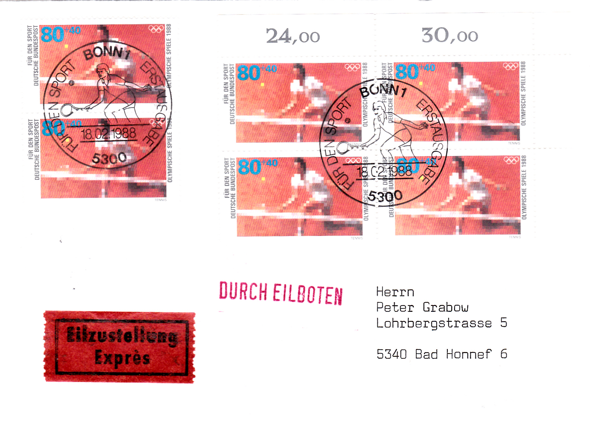Brief von Bonn nach Bad Honnef mit sechs Marken zu 80+40Pf (MiNr 1354) der Deutschen Bundespost zu den Sommerspielen 1988 mit der Abbildung eines Tennisspielers mit dem Ersttagsonderstempel Bonn. Das Port berechnet sich so: Brief über 20g bis 50g 130Pf und für Eilzustellung 350Pf, zusammen 480Pf.