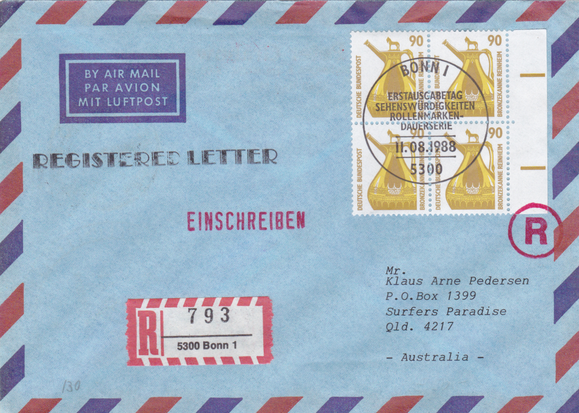Brief (bis 5g) vom 11.8.1988 per Einschreiben mit Luftpost von Bonn nach Australien mit einem Viererstreifen der Marke zu 90Pf mit dem Motiv "Bronzekanne, Reinheim" aus der Rolle (2. Marke von links mit rückseitiger Nummer). Dir Marken sind mit dem Ersttagsonderstempel Bonn gestempelt. Das Porto betrug: Auslandbrief bis 20g 120Pf, Einschreiben 200Pf, Zuschlag für Luftpost nach Australien je 5g 40Pf, zusammen 360Pf.