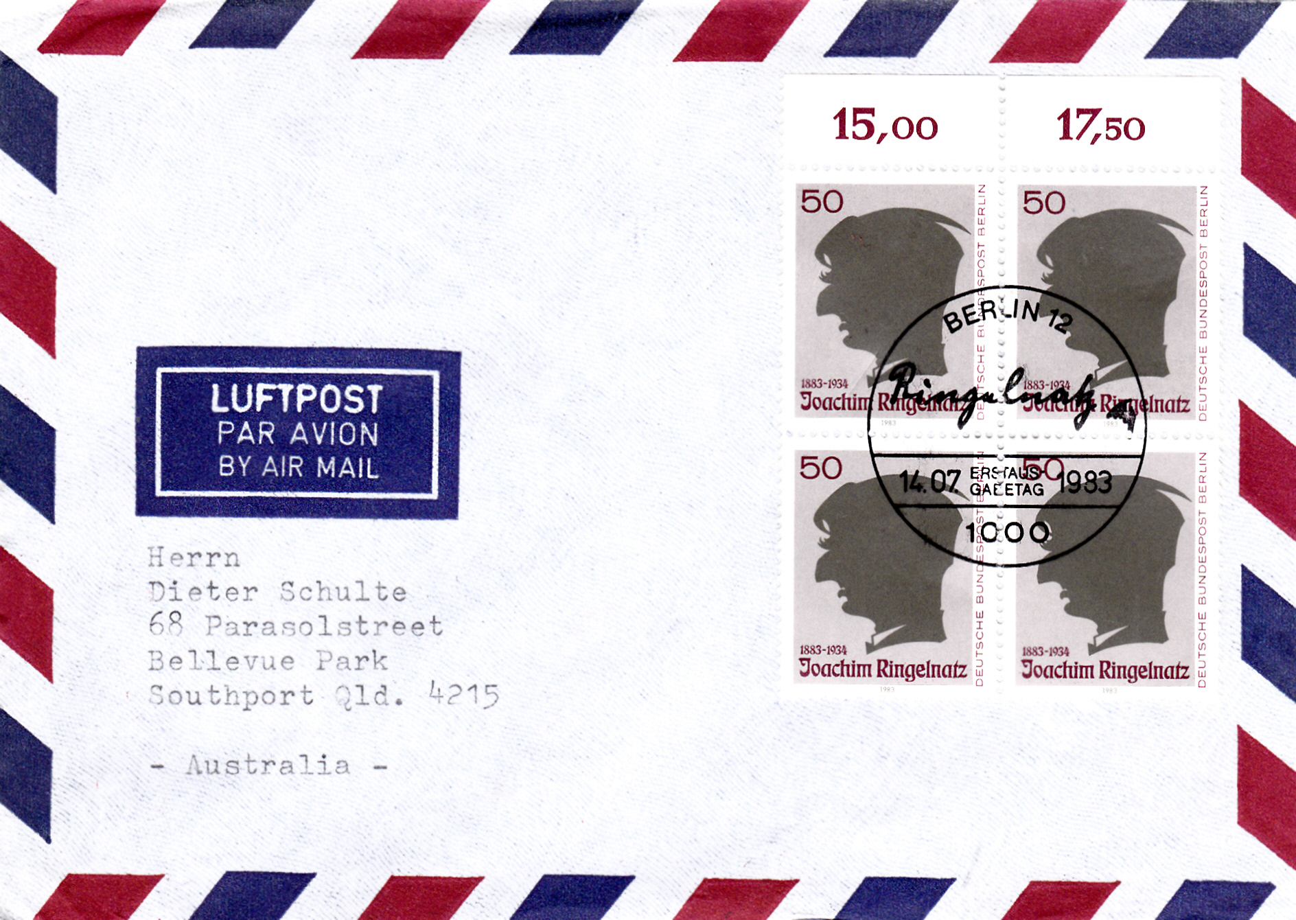 Portogerechter Brief mit Luftpost nach Australien mit Mehrfachfrankatur der Marke zum 100. Geburtstag von Joachim Ringelnatz (MiNr Berlin 701) und Ersttagstempel Berlin. Das Porto betrug: Auslandbrief (bis 20g) 120Pf, Zuschlag für Luftpost 6-10g nach Australien je 5g 40Pf, (2x 40Pf = 80Pf) zusammen also 200Pf.