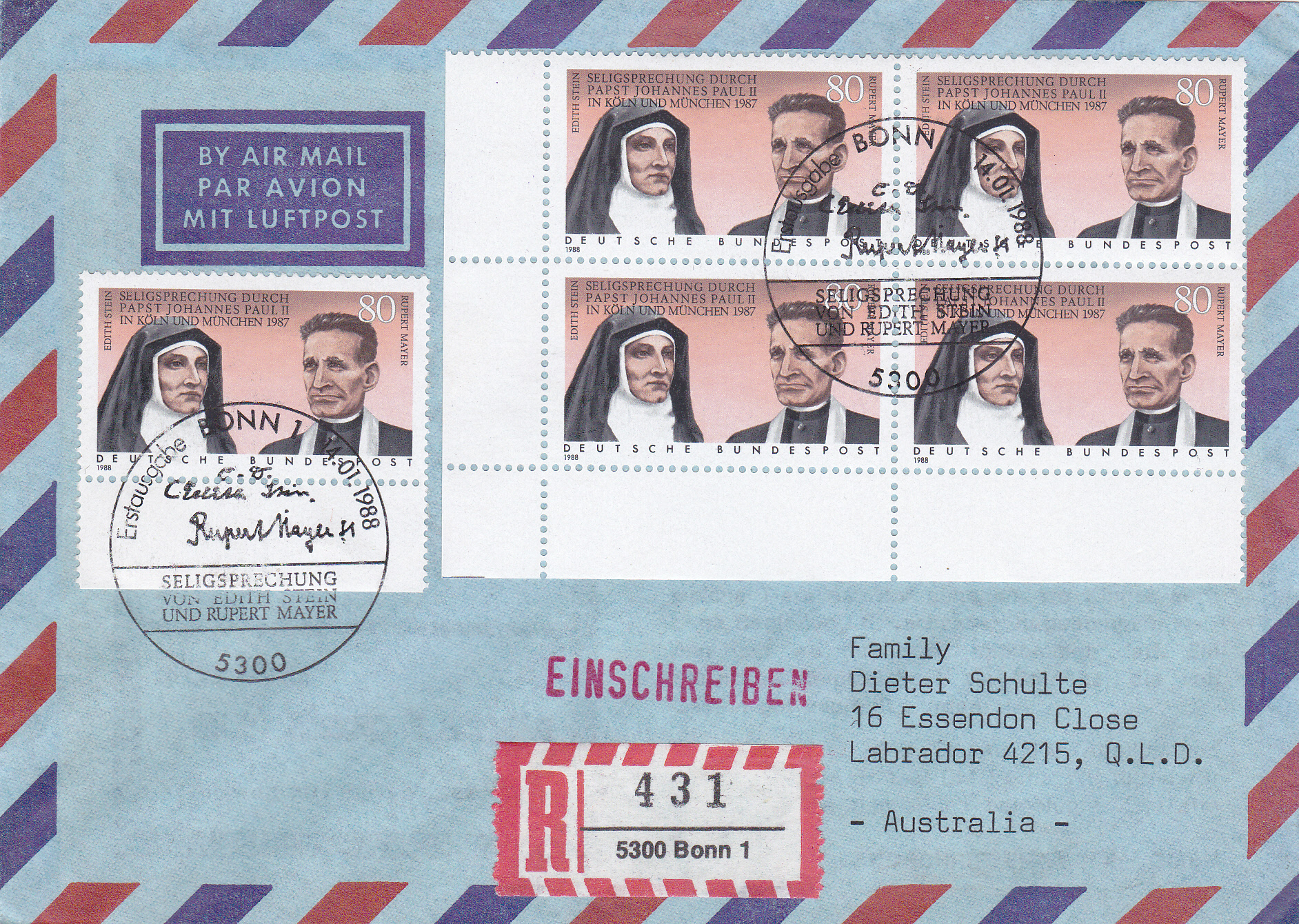 Luftpost-Einschreiben (bis 10g) vom 14.1.1988 von Bonn nach Australien mit einer Mehrfachfrankatur der Marke "Seligsprechung von Edith Stein und Pater Rupert Mayer durch Papst Johannes Paul II." (MiNr 1352) mit dem Ersttagsonderstempel Bonn. Das Porto betrug: Auslandbrief (bis 20g) 120Pf, Einschreiben 200Pf, Zuschlag für Luftpost 6-10g nach Australien je 5g 40Pf, (2x 40Pf = 80Pf) zusammen also 400Pf.