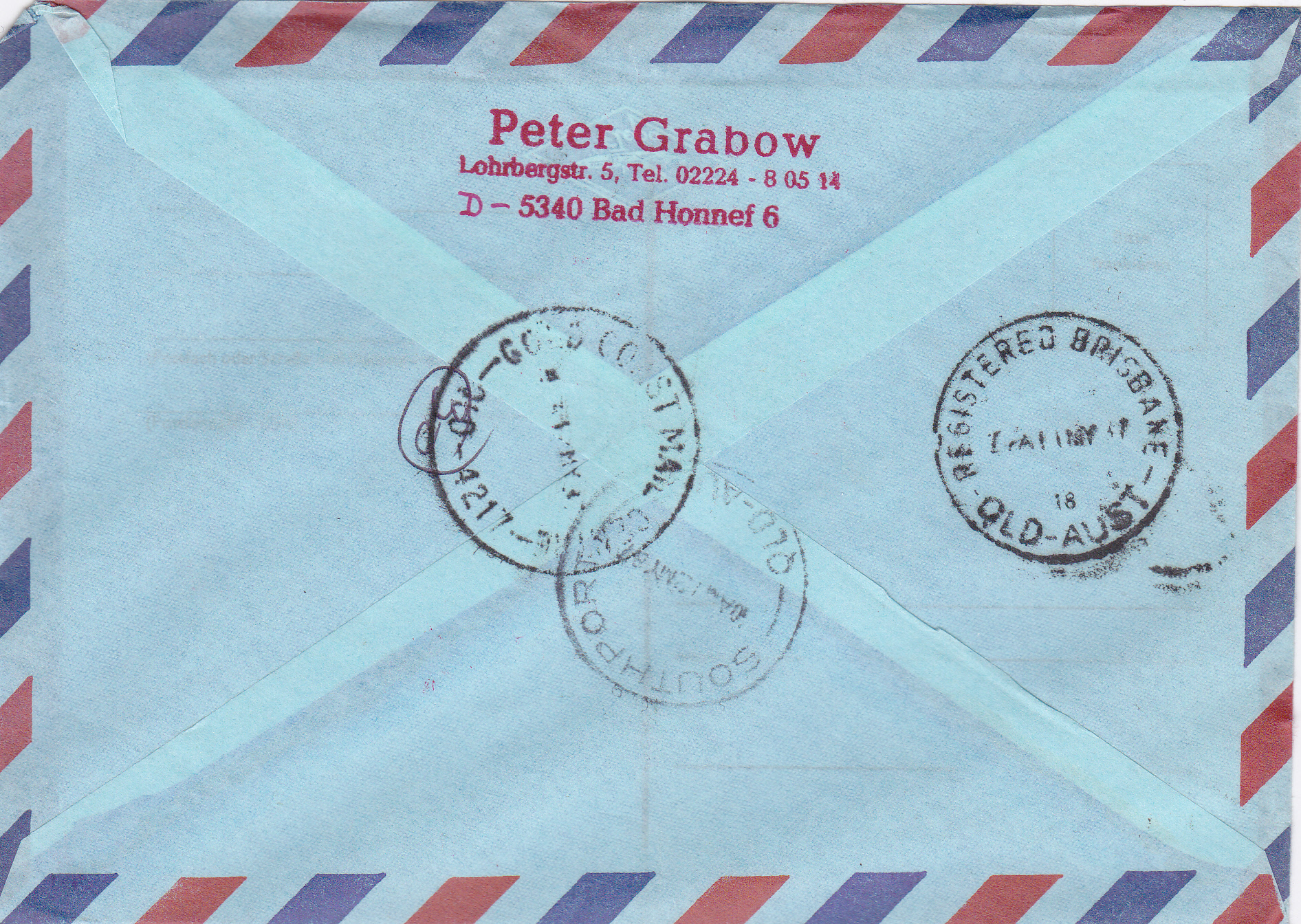 Luftpost-Einschreiben (bis 10g) vom 5.5.1987 von Bonn nach Australien mit einer Mehrfachfrankatur der Marke "300. Geburtstag von Johann Albrecht Bengel" (MiNr 1324) mit dem Ersttagsonderstempel Bonn. Das Porto betrug: Auslandbrief (bis 20g) 120Pf, Einschreiben 200Pf, Zuschlag für Luftpost 6-10g nach Australien je 5g 40Pf, (2x 40Pf = 80Pf) zusammen also 400Pf.