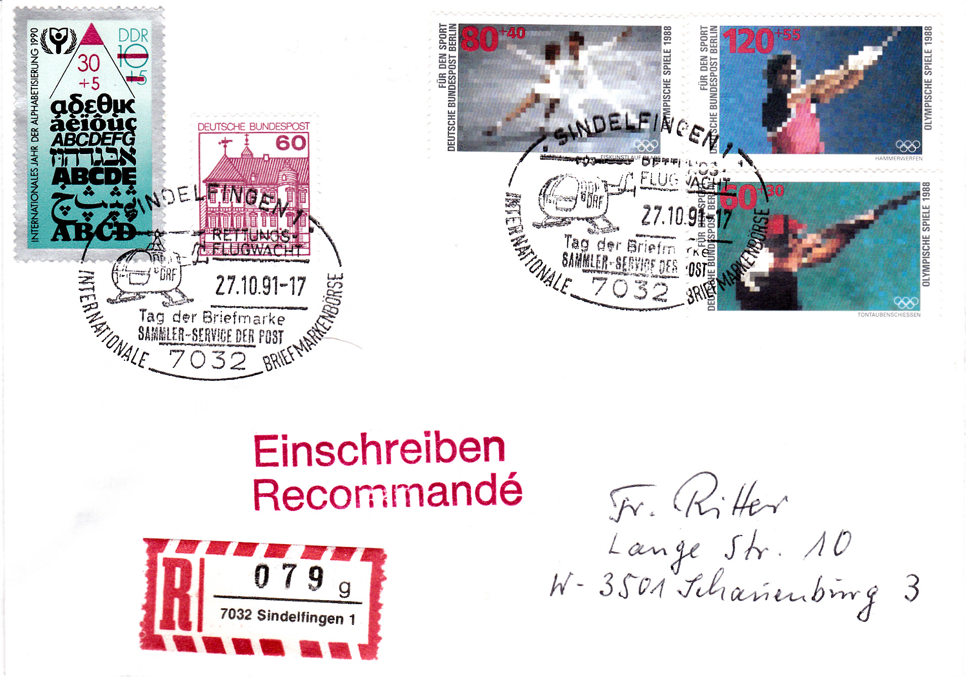 Standardbrief mit Einschreiben vom 27.10.1991 von Sindelfingen nach Schaumburg. Seit 18.4.1989 betrug das Porto für den Brief 100Pf und die Zusatzleistung Einschreiben kostete 250Pf (bis 30.6.1992), zusammen also 350Pf.