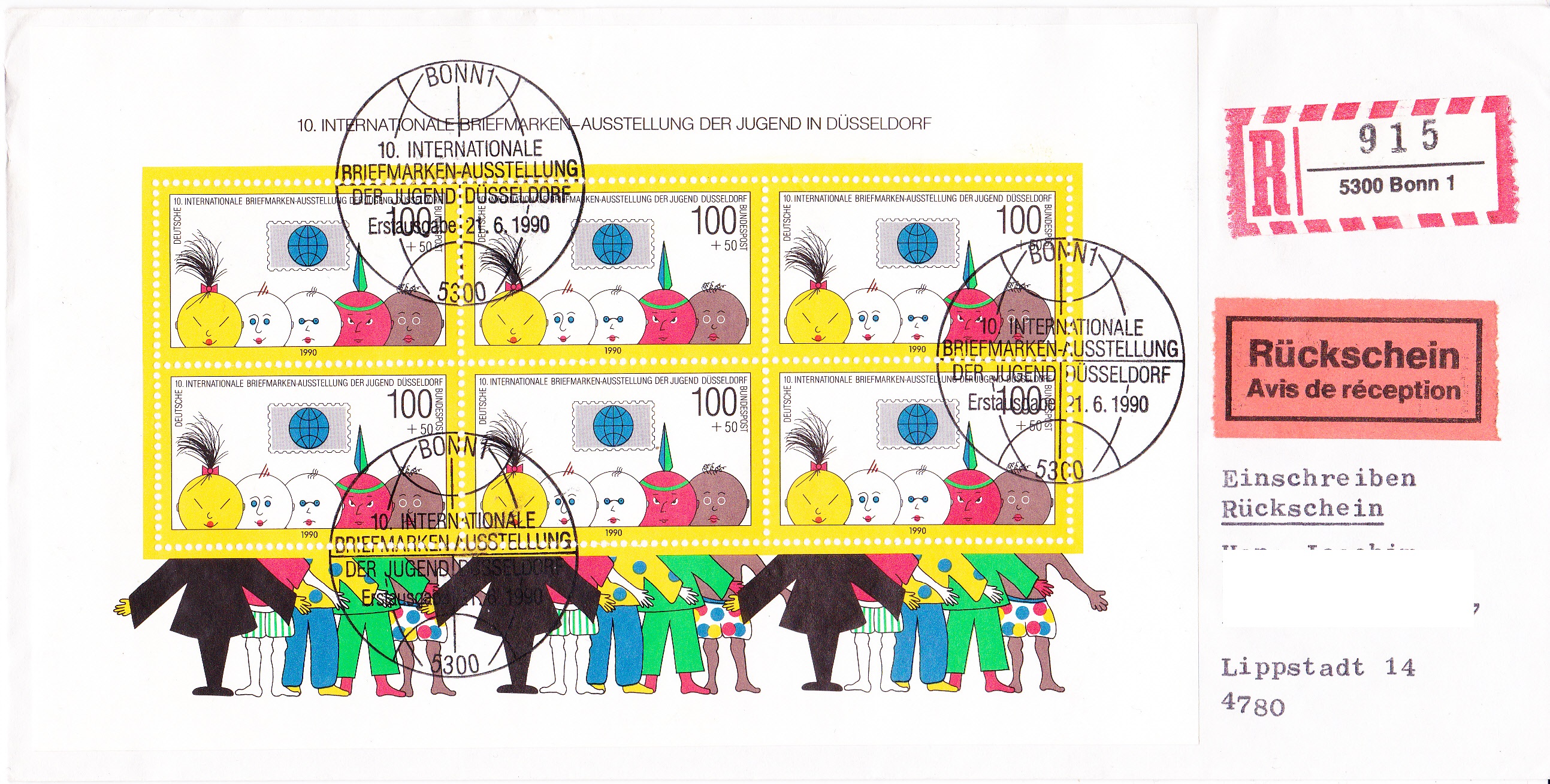 Standardbrief mit Einschreiben und Rückschein vom 12.6.1990 von Bonn nach Lippstadt. Seit 18.4.1989 betrug das Porto für den Brief 100Pf und die Zusatzleistungen Einschreiben und Rückschein kosteten je 250Pf (bis 30.6.1992), zusammen also 600Pf. Zur Frankatur wurde der Block zur Düsseldorf 90 mit 6 Marken zu je 100+50Pf portogerecht verwendet. Er wurde mit dem Ersttagsonderstempel Bonn entwertet.