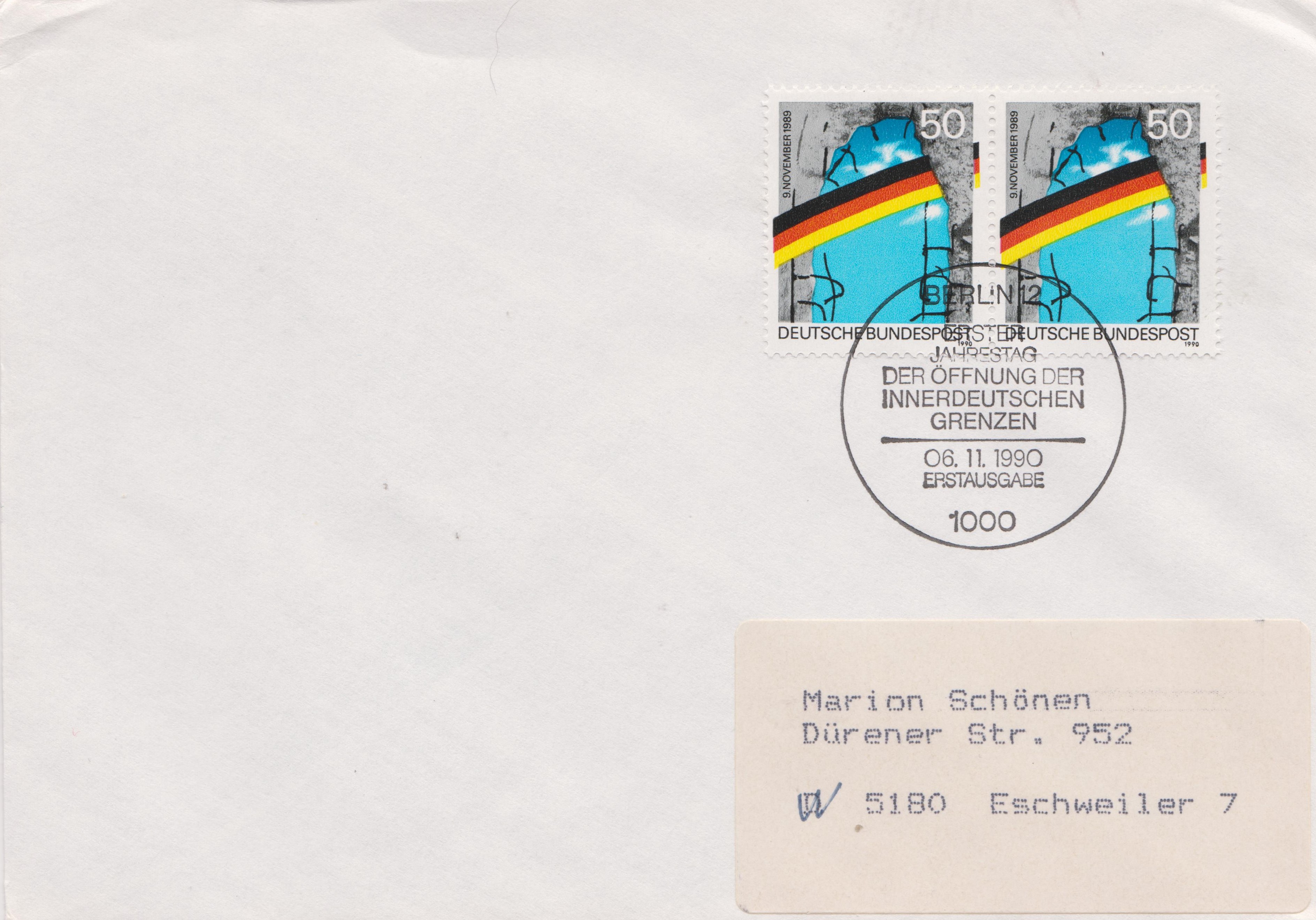 Dieser Brief von Berlin nach Eschweiler wurde mit einem Paar der Marke zu 50 Pf zum 1. Jahrestag der Maueröffnung, MiNr. 1481 I, frankiert und per Ersttagsstempel entwertet.
