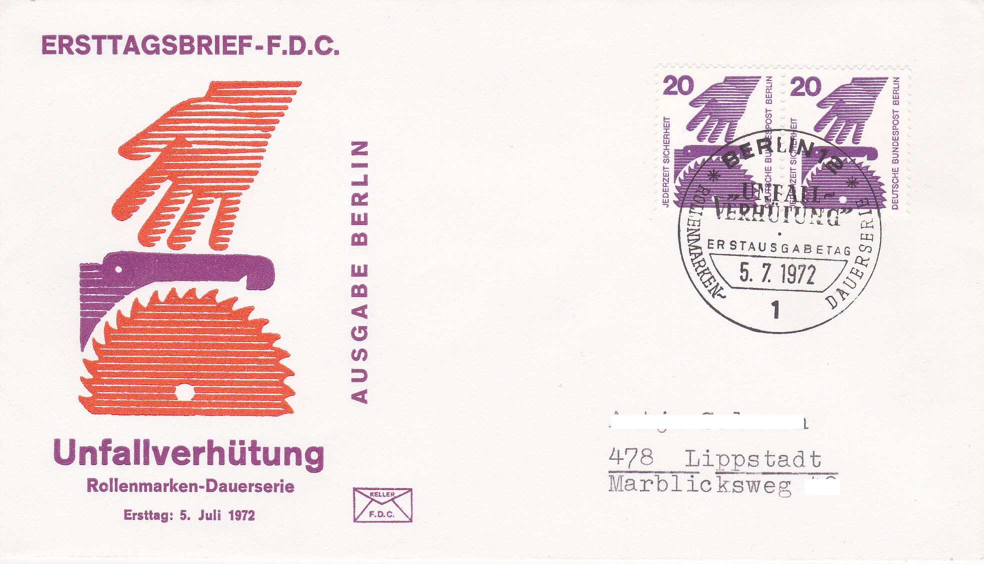 Im Zeitraum 1.7.1972 - 30.6.1974 kostete ein Standardbrief (bis 20h) 40Pf. Dieser Brief von Berlin nach Lippstadt wurde mit einem waagerechten Paar der Marke zu 20Pf aus der DS "Unfallverhütung" (MiNr Berlin 404 A) frankiert am Ersttag der Marke mit dem Ersttagsonderstempel Berlin gestempelt.