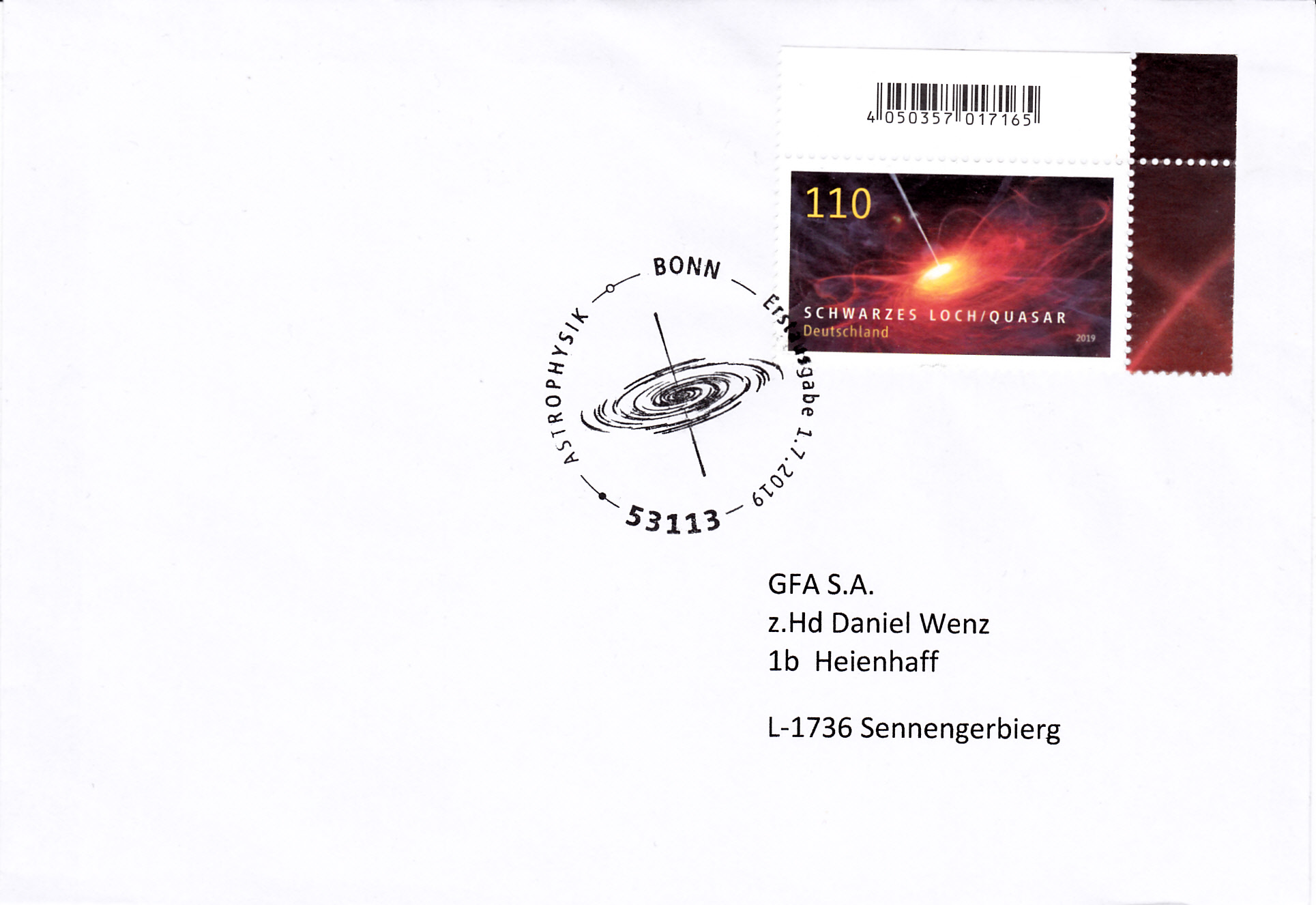 Seit 1.7.2019 kostetet ein Standardbrief ins Ausland 110 Cent. Dieser Brief wurde mit der Marke zu 110 Cent aus der Serie Astrophysik (MiNr 3477) am Ersttag de Marke von Bonn nach Luxemburg verschickt.