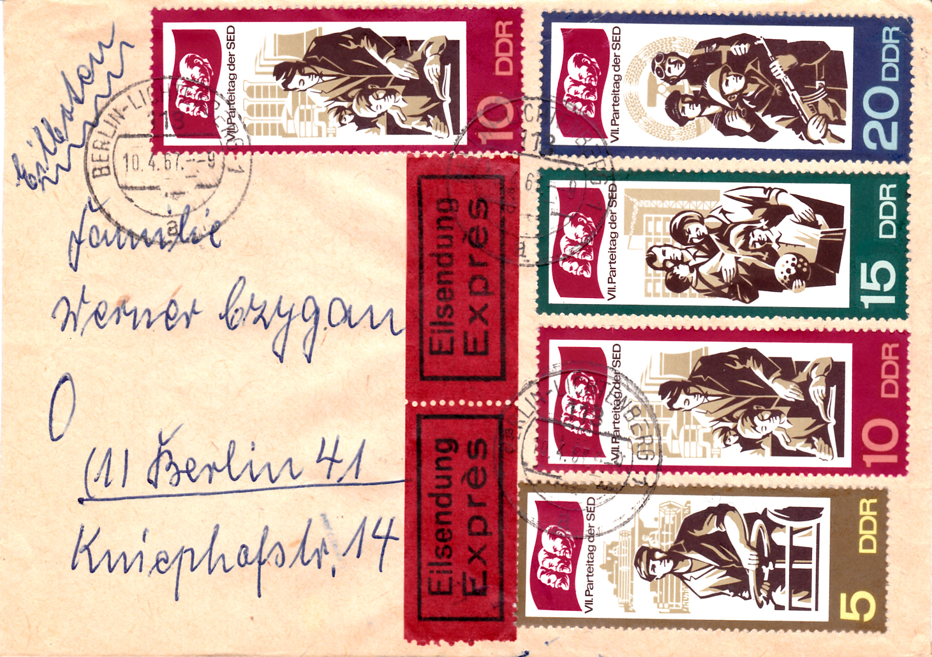 Dieser Brief wurde am 10.4.1967 von Berlin-Lichtenberg nach Berlin 41 mit Eilzustellung verschickt. Das Porto setzt sich so zusammen: Standardbrief im Ortstarif 10Pf, Zuschlag für die Eilzustellung 50Pf ergibt zusammen 60Pf.
