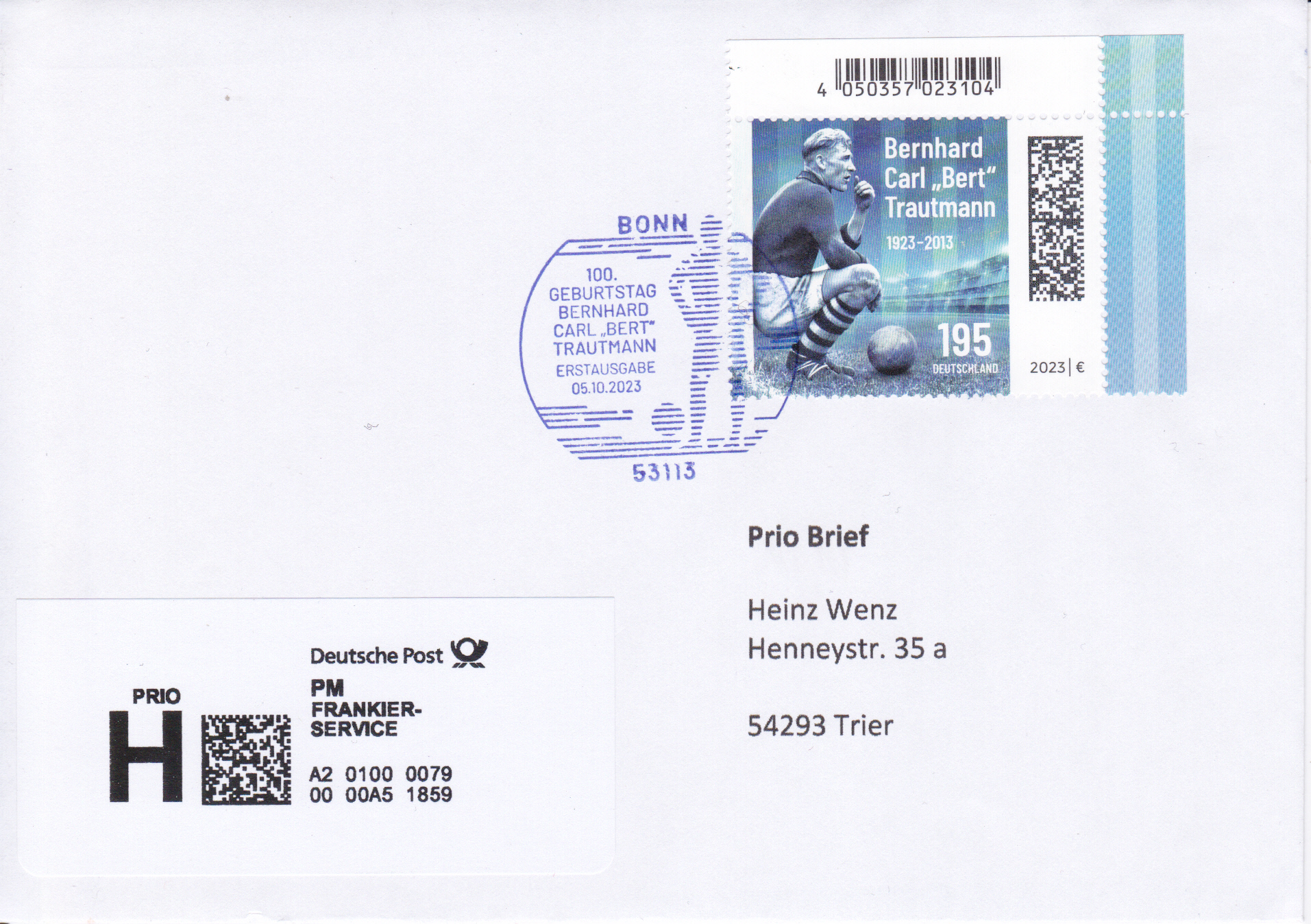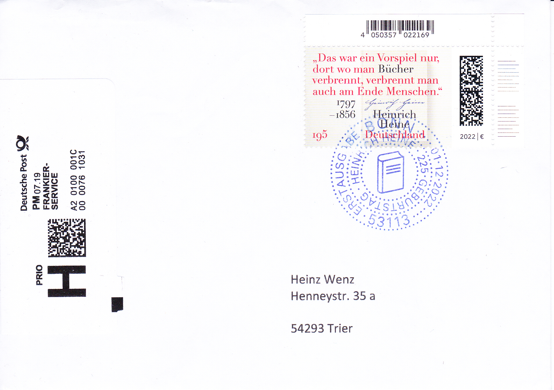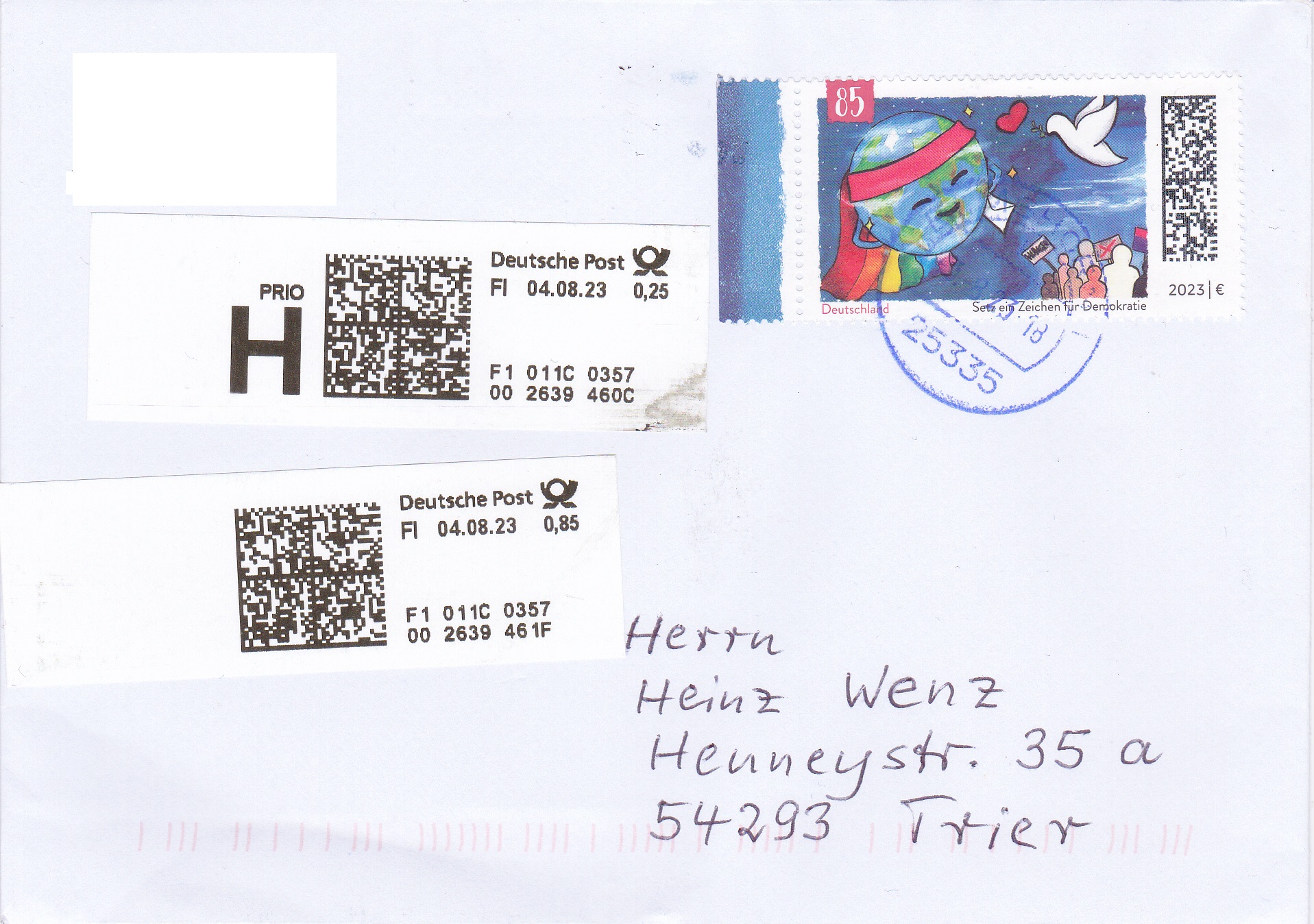 Dieser Brief wurde mit der Marke "Demokratie" zu 85 Cent (MiNr 3769) frankiert. und in einer Postagentur als Priobrief aufgegeben. Offensichtlich war der Mitarbeiter der Postagentur zunächst mit dem Priobrief "überfordert". Er druckte ein Label "Priobrief" mit dem Wert 0,25€ aus. Er dachte wohl, dass der Priobrief insgesamt 1,10€ kostet. Er bemerkt dann wohl seinen Fehler (Der ZUSCHLAG zum Briefporto beträgt 1,10€) und fertigte noch ein zusätzliches Label zu 0,85€ aus.