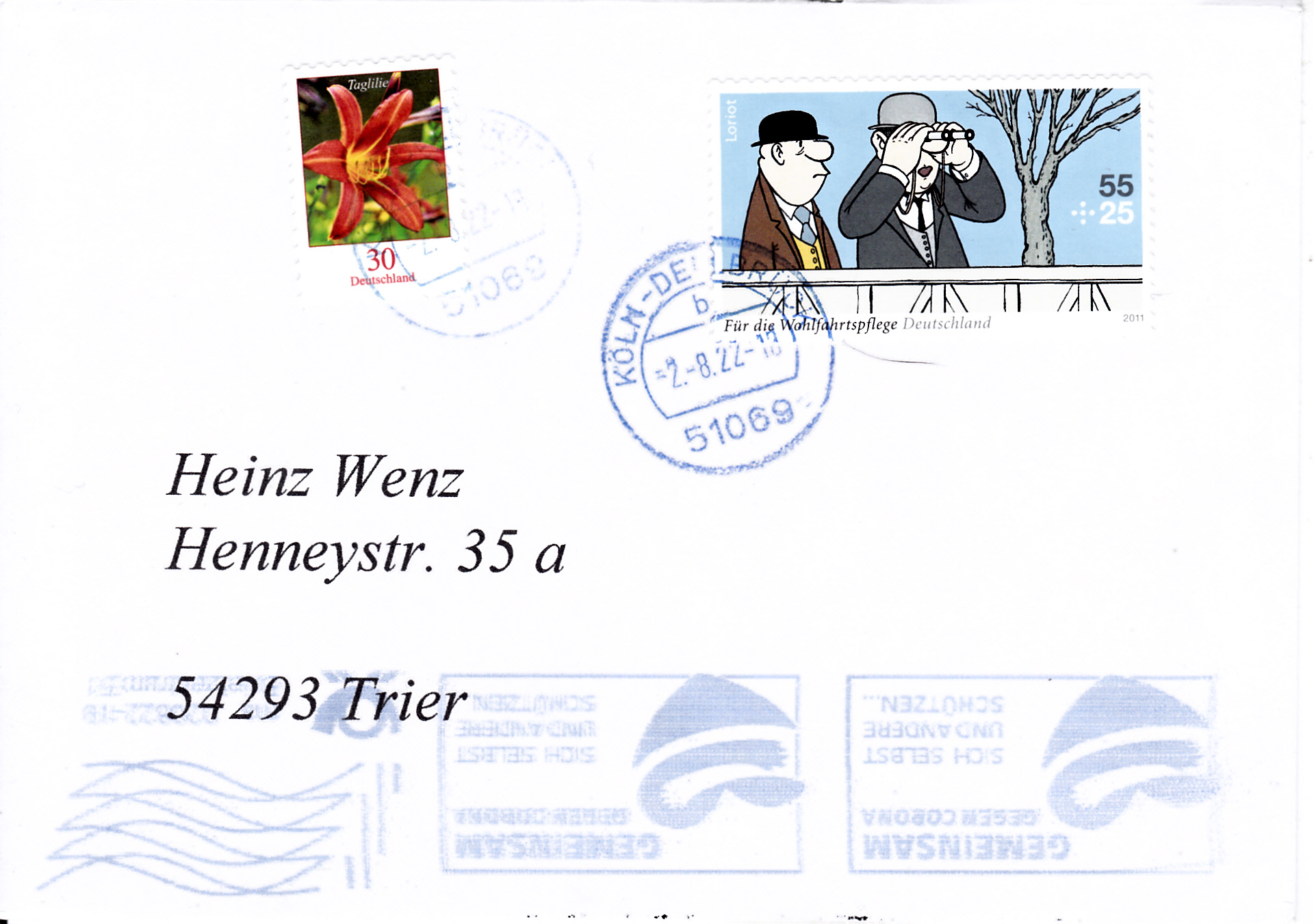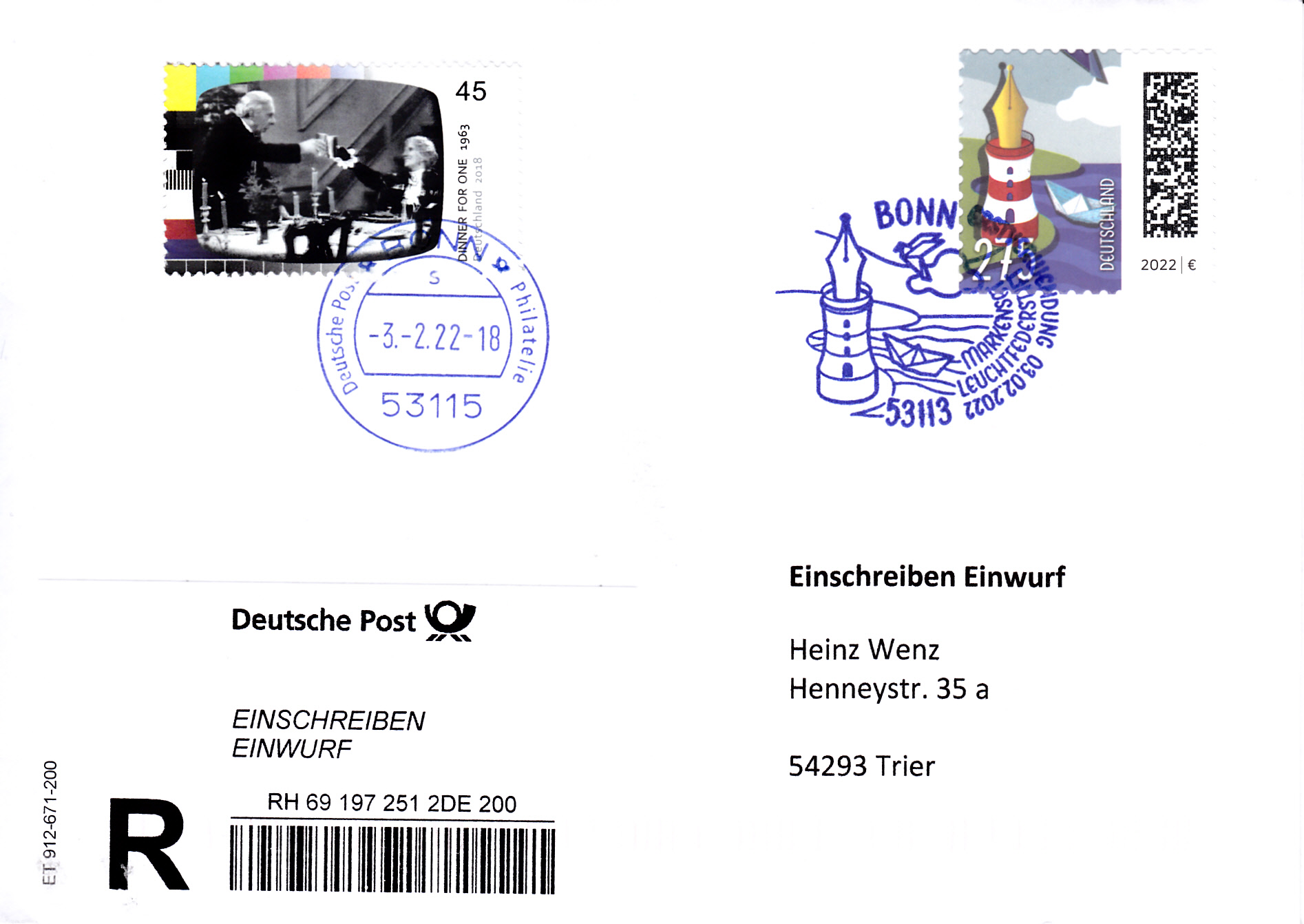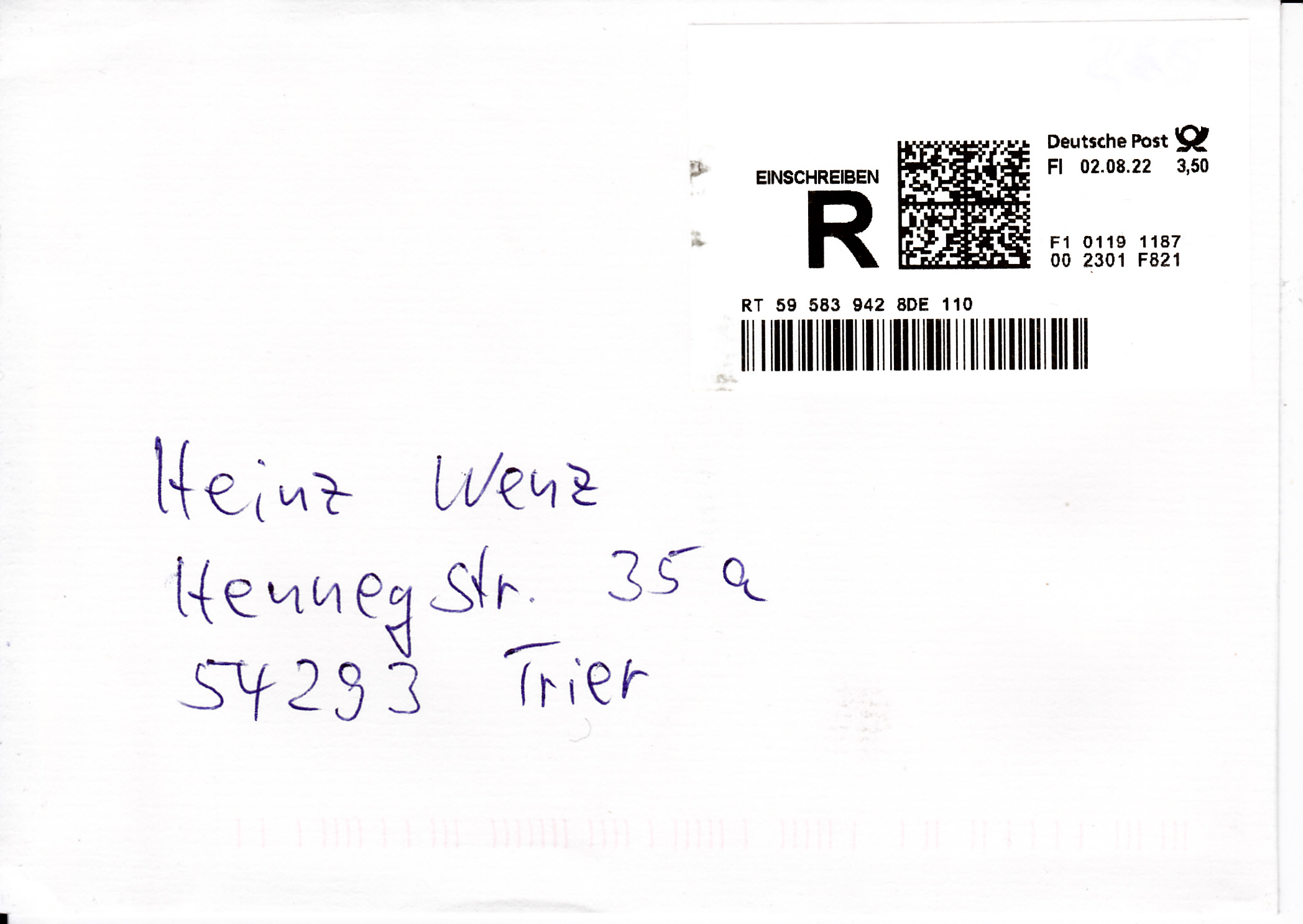 Dieser Brief wurde mit der Marke "Demokratie" zu 85 Cent (MiNr 3769) frankiert. und in einer Postagentur als Priobrief aufgegeben. Offensichtlich war der Mitarbeiter der Postagentur zunächst mit dem Priobrief "überfordert". Er druckte ein Label "Priobrief" mit dem Wert 0,25€ aus. Er dachte wohl, dass der Priobrief insgesamt 1,10€ kostet. Er bemerkt dann wohl seinen Fehler (Der ZUSCHLAG zum Briefporto beträgt 1,10€) und fertigte noch ein zusätzliches Label zu 0,85€ aus.