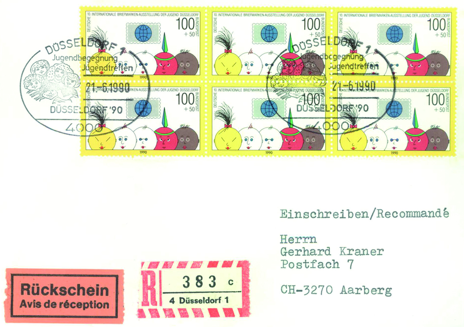 Ein Standardbrief (bis 20g) in CEPT-Länder kostete ab 1.4.1989 bis 31.8.1997 100Pf. Dieser Brief mit Einschreiben und Rückschein vom 21.6.1990 in die Schweiz ist portorichtig mit 6 Marken zu 100+50Pf Düsseldorf'90 frankiert. Das Port berechnet sich wie folgt: Brief bis 20g Cept.-Länder 100Pf, Einschreiben 250Pf und Rückschein 250Pf, macht zusammen 600Pf.