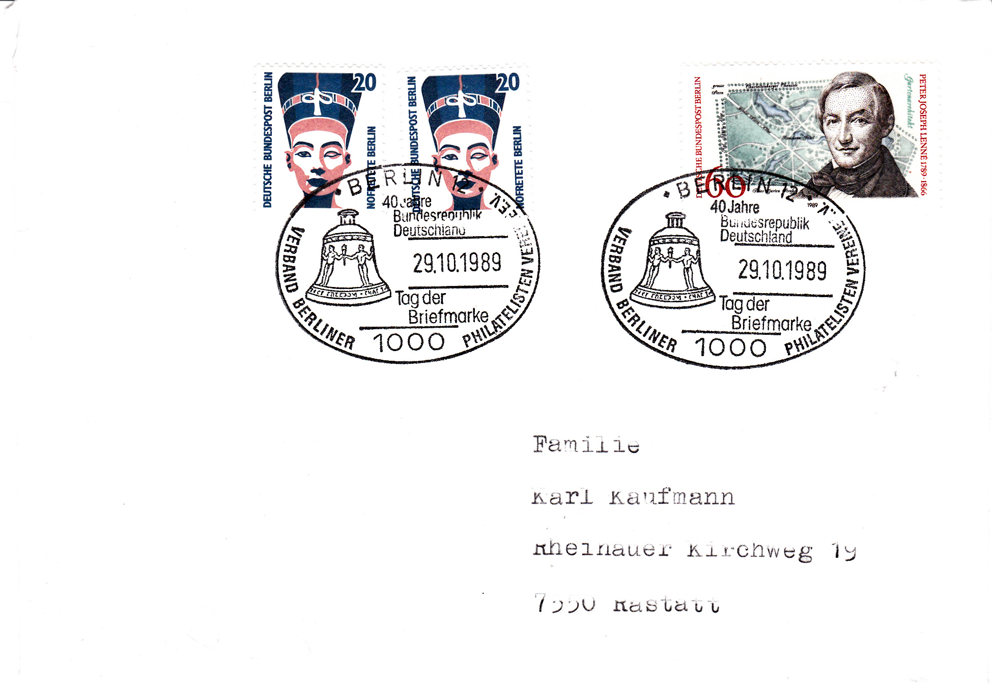 Hier ein von Berlin nach Rastatt mit einer Marke zu 60Pf (Berlin MiNr 850) und zwei Marken zu je 20Pf (MiNr 831) und einem Sonderstempel zum Tag der Briefmarke 1989 vom 29.10.1989.