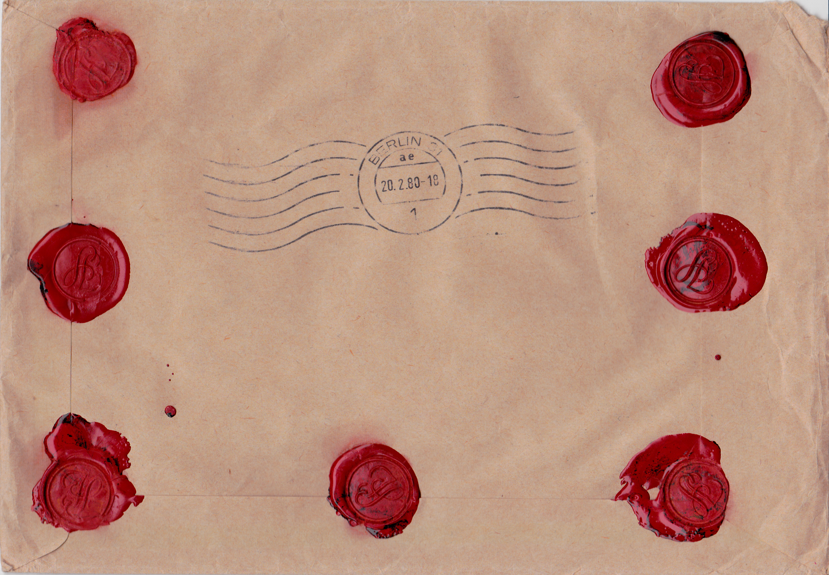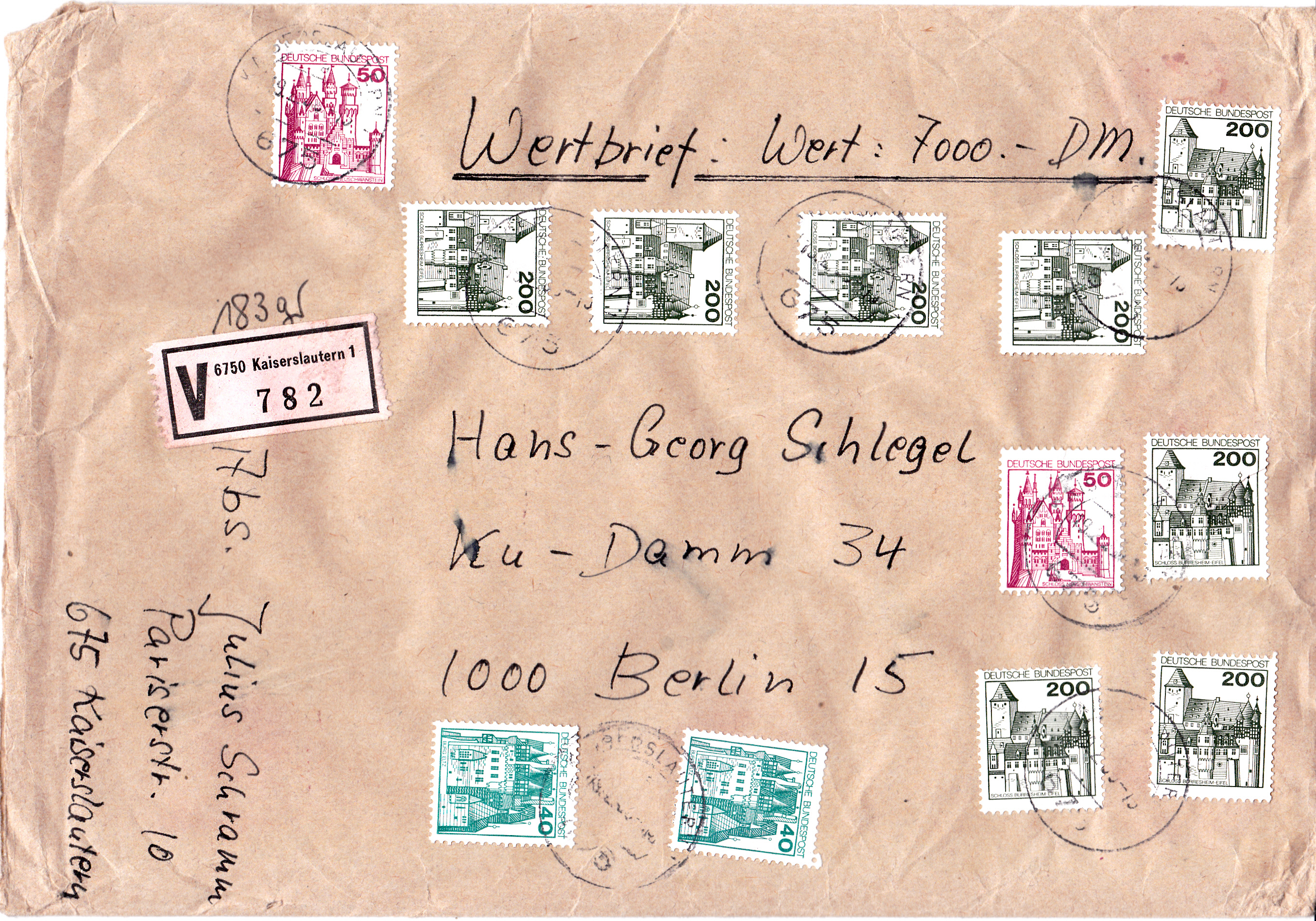 Hier ein Brief von 183g vom 19.2.1980 von Kaiserslautern nach Berlin mit einer Wertangabe von 7000DM. Das Porto berechnet sich wie folgt: Brief bis 250g 180Pf, Wertbrief bis 500 DM 300Pf für je weitere 500 DM jeweils 100Pf ergibt zusammen 180Pf + 300Pf + 13x100Pf = 1780Pf. Zur Frankatur wurde Marken aus der DS Burgen und Schlösser verwendet: 8 x 200Pf (MiNr 920), 2 x 50Pf (MiNr 916) und 2 x 40Pf (MiNr 915).