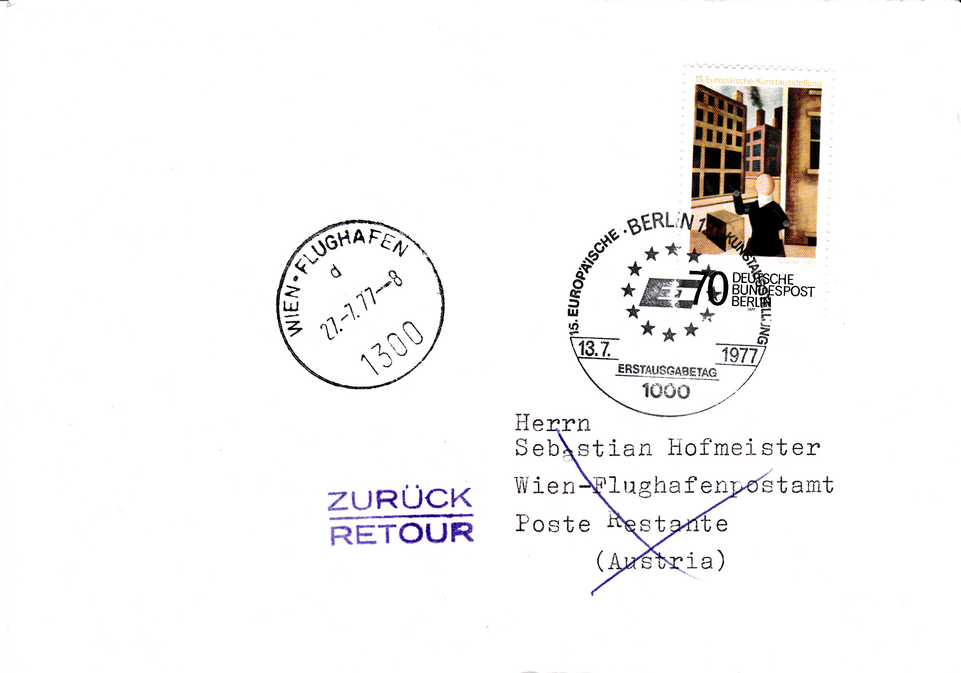Brief von Bonn nach Wien vom 13.5.1976. Da der Brief postlagernd beim Flughafen Wien verschickt wurde und dort in der Lagerfrist nicht abgeholt wurde, trat er am 23.5.1976 die Rückreise an.