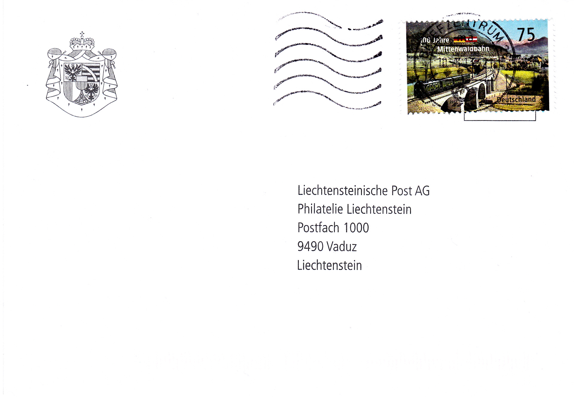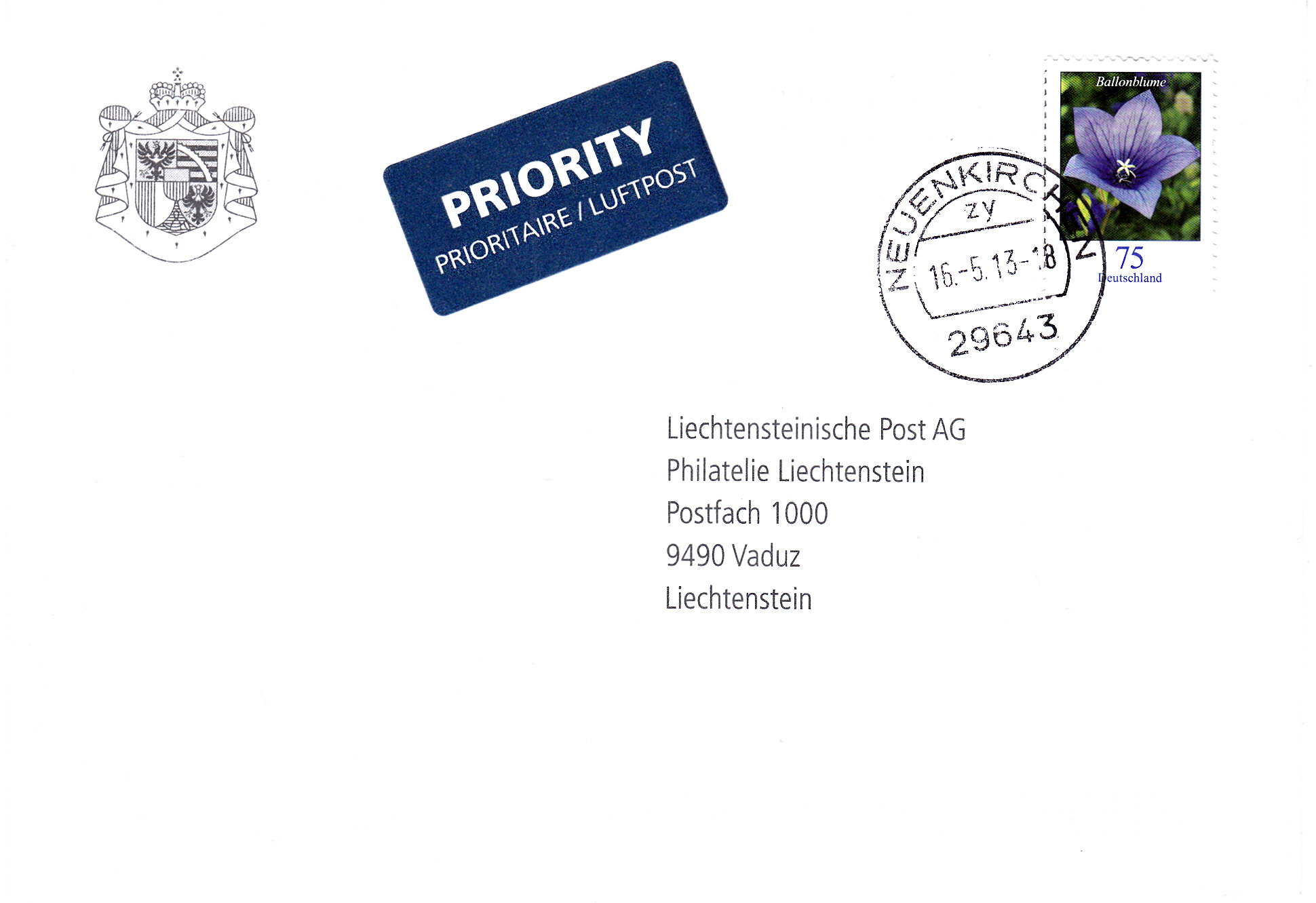 Vom 1.1.2011-31.12.2014 kostetete ein Standardbrief ins Ausland 75 Cent. Dieser Brief wurde am 16.5.2013 von Neuenkirchen nach Vaduz (Liechtenstein) verschickt. Als Frankatur wurde die Marke zu 75 Cent aus der DS Blumen (MiNr 2835) verklebt.