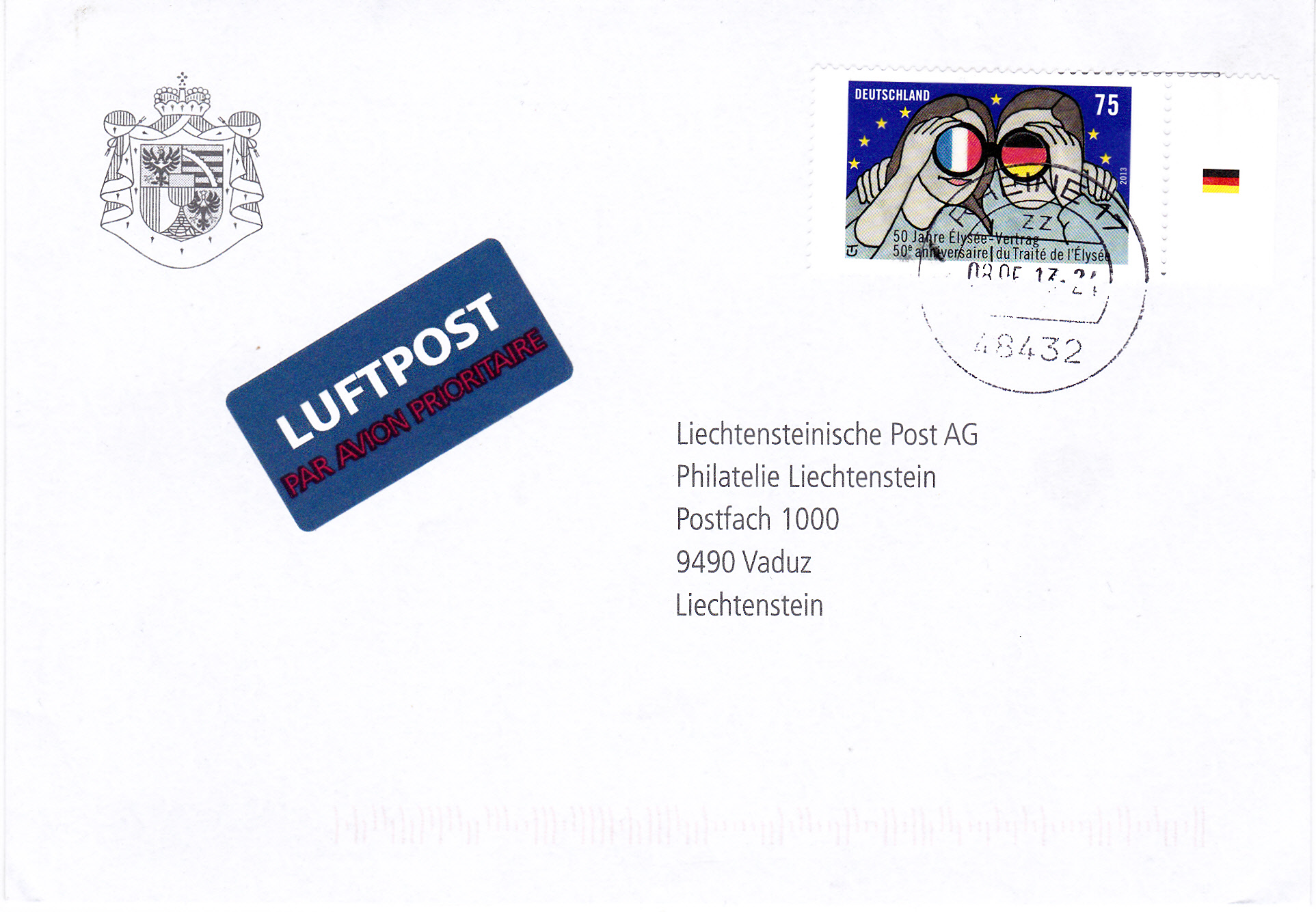 Dieser Brief wurde am 8.5.2013 von Rheine nach Vaduz (Liechtenstein) verschickt. Zur Frankatur wurde die Marke zu 75 Cent "50 Jahre Elysée-Vertrag über die deutsch-französische Zusammenarbeit" (MiNr 2977) benutzt.