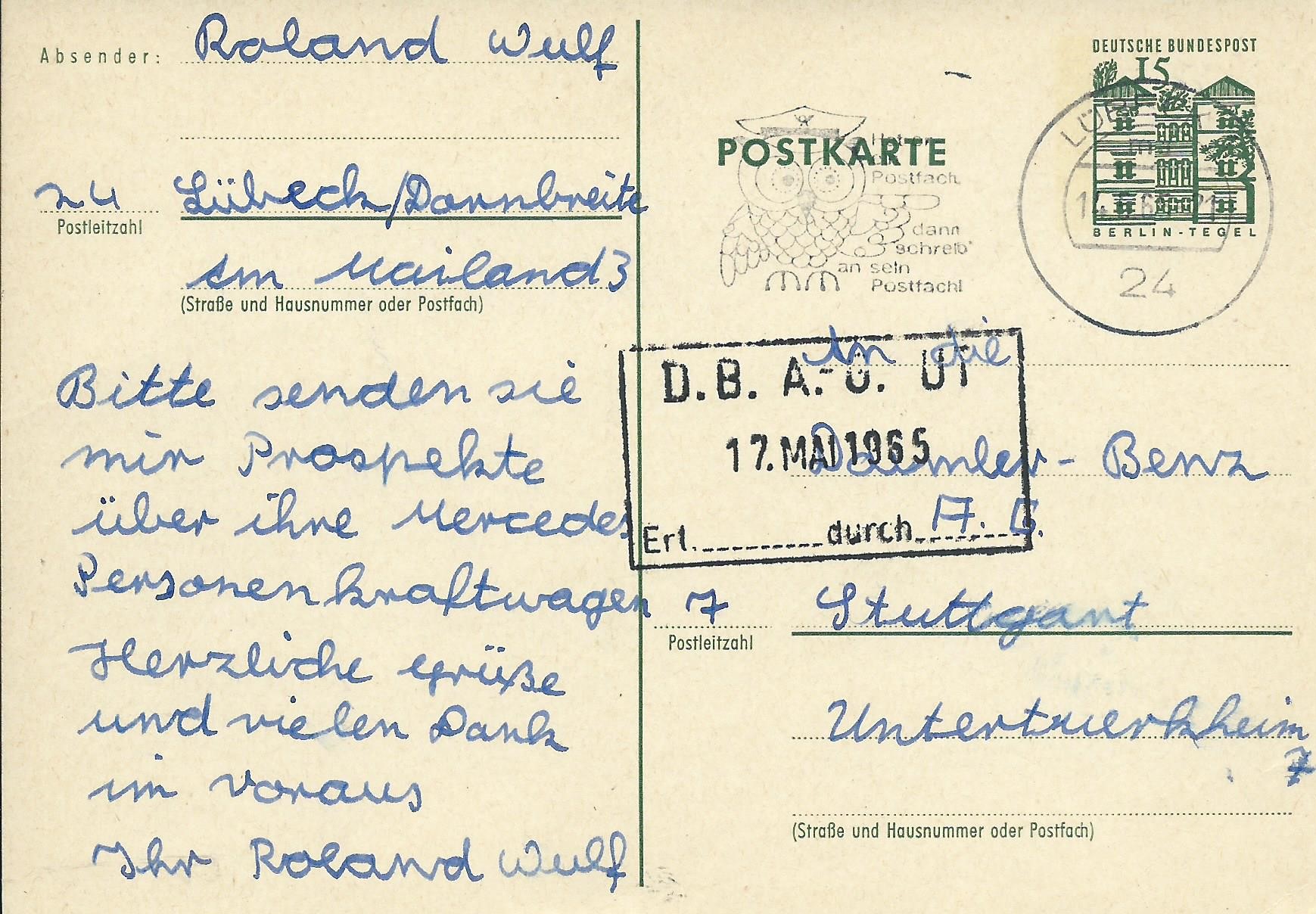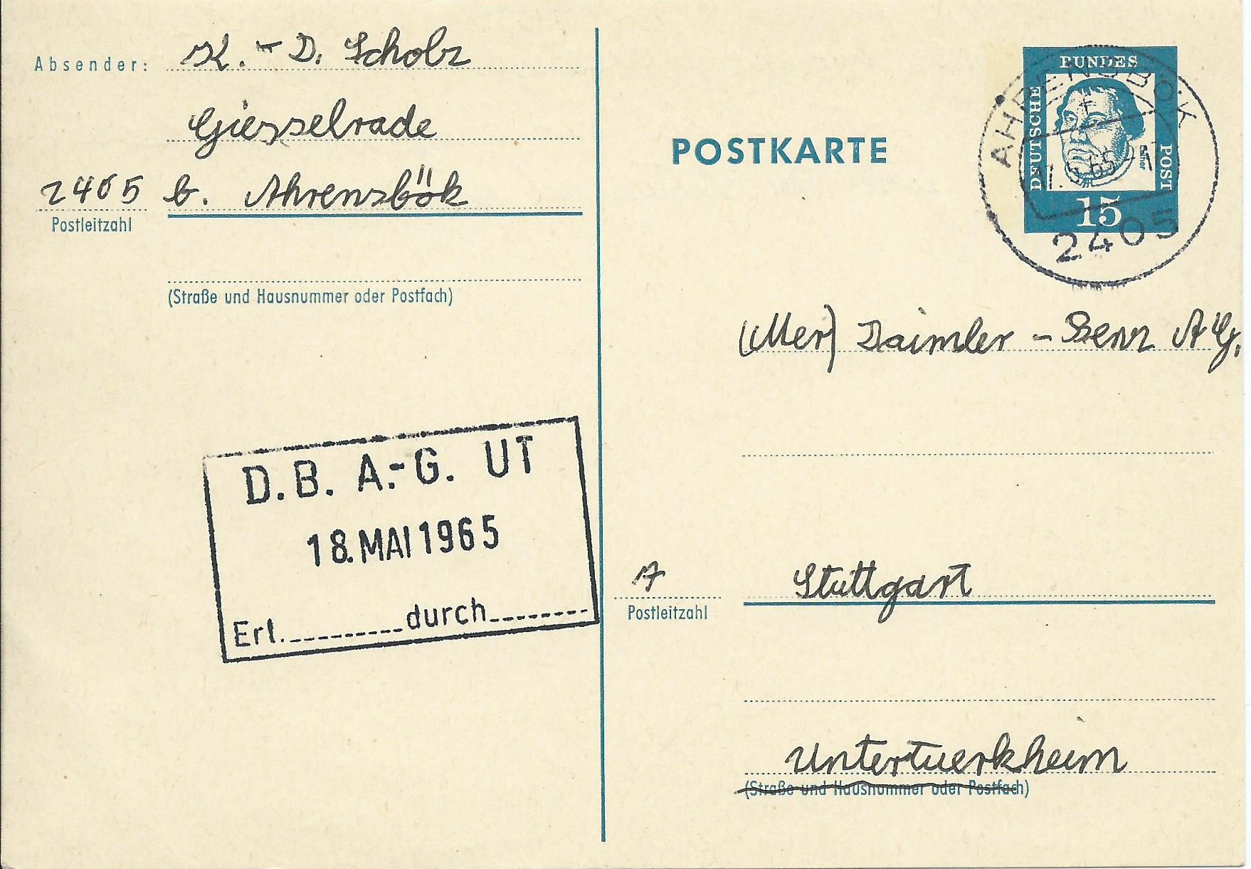 in der Wertstufe 15 Pf sind auch Postkarten als Ganzsache verausgabt worden. Hier eine mit dem Wertstempel Bedeutende Deutsche 15 Pf, abgestempelt in Ahrensbök am 17.5.65.