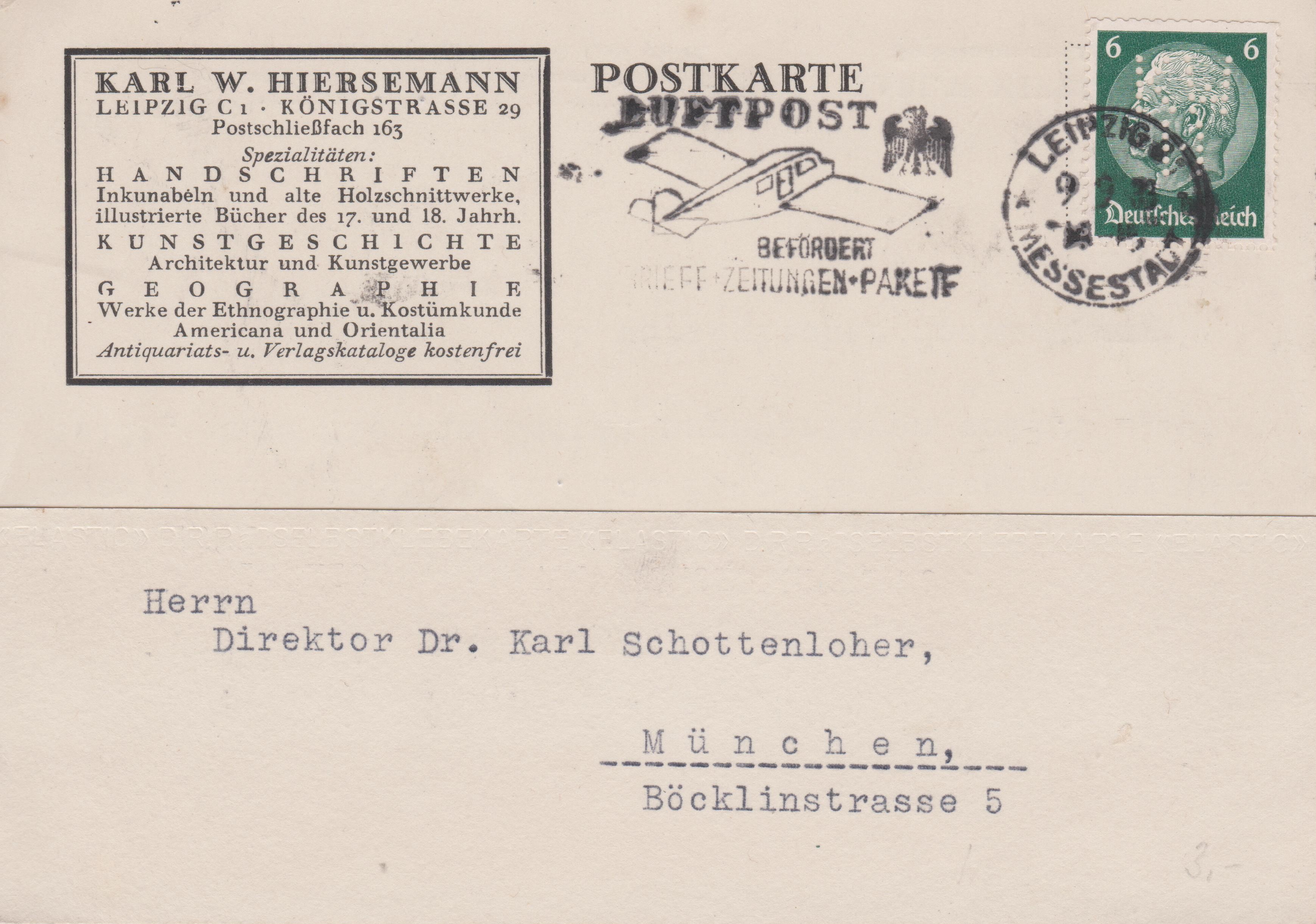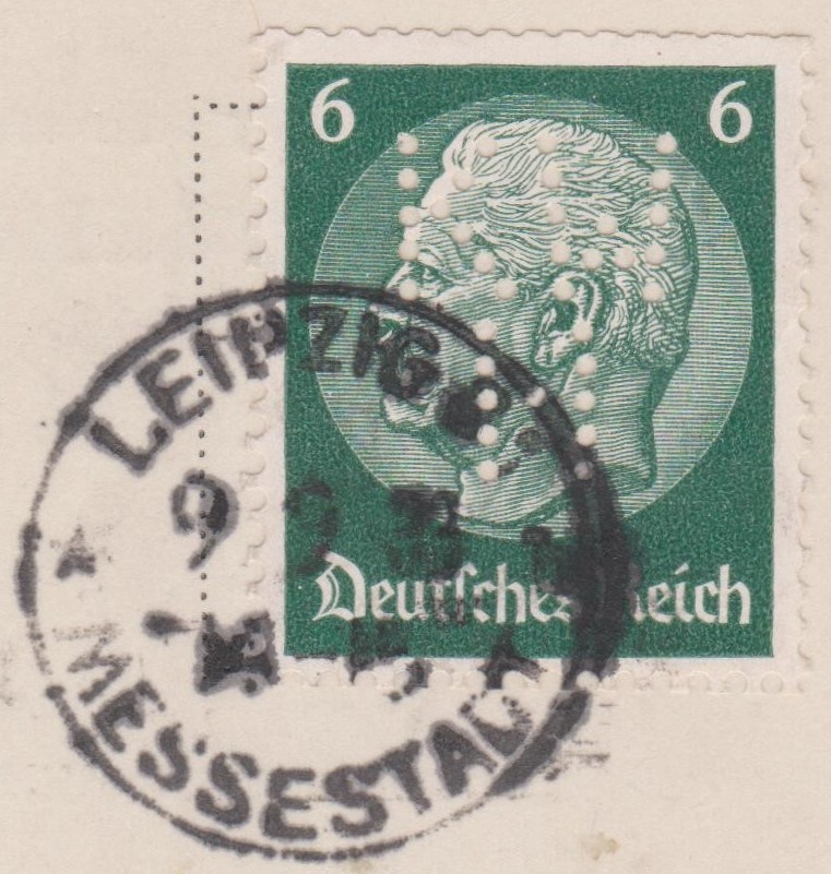 Das Postwertzeichen hat eine Firmenlochung "K W H" des Absenders "KARL W. HIERSMANN":