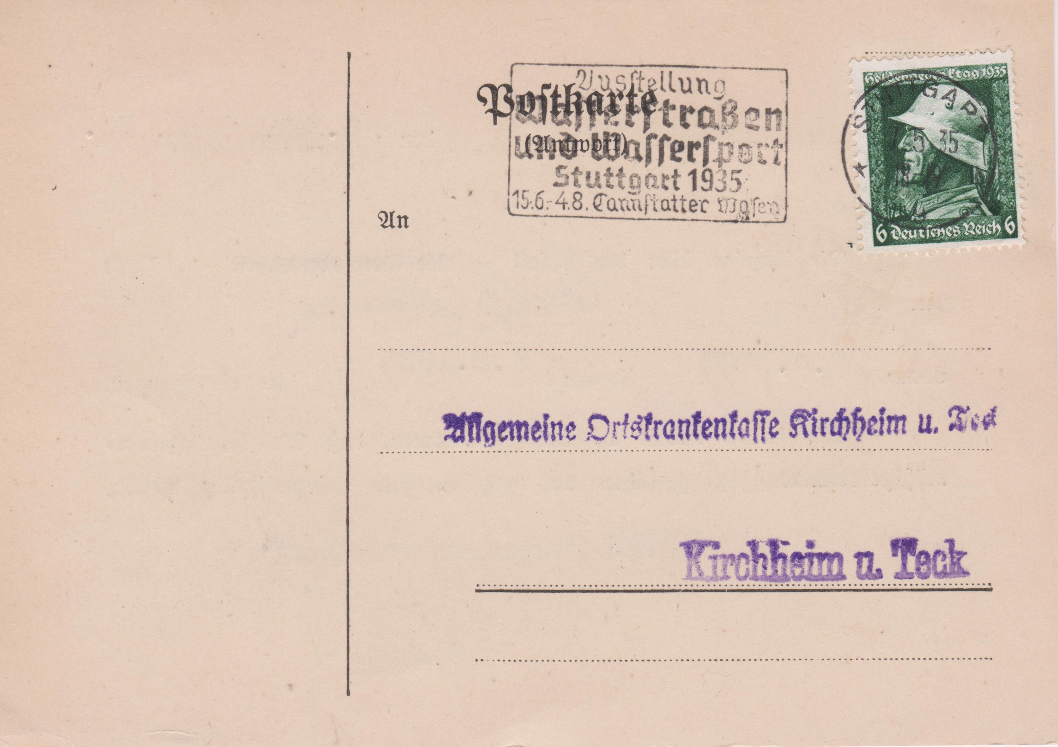 EF Deutsches Reich MiNr. 569 y am 07.05.1935 auf Postkarte im Fernverkehr von STUTTGART nach Kirchheim mit Werbeeinsatz "Ausstellung Wasserstraßen und Wassersport Stuttgart 1935":