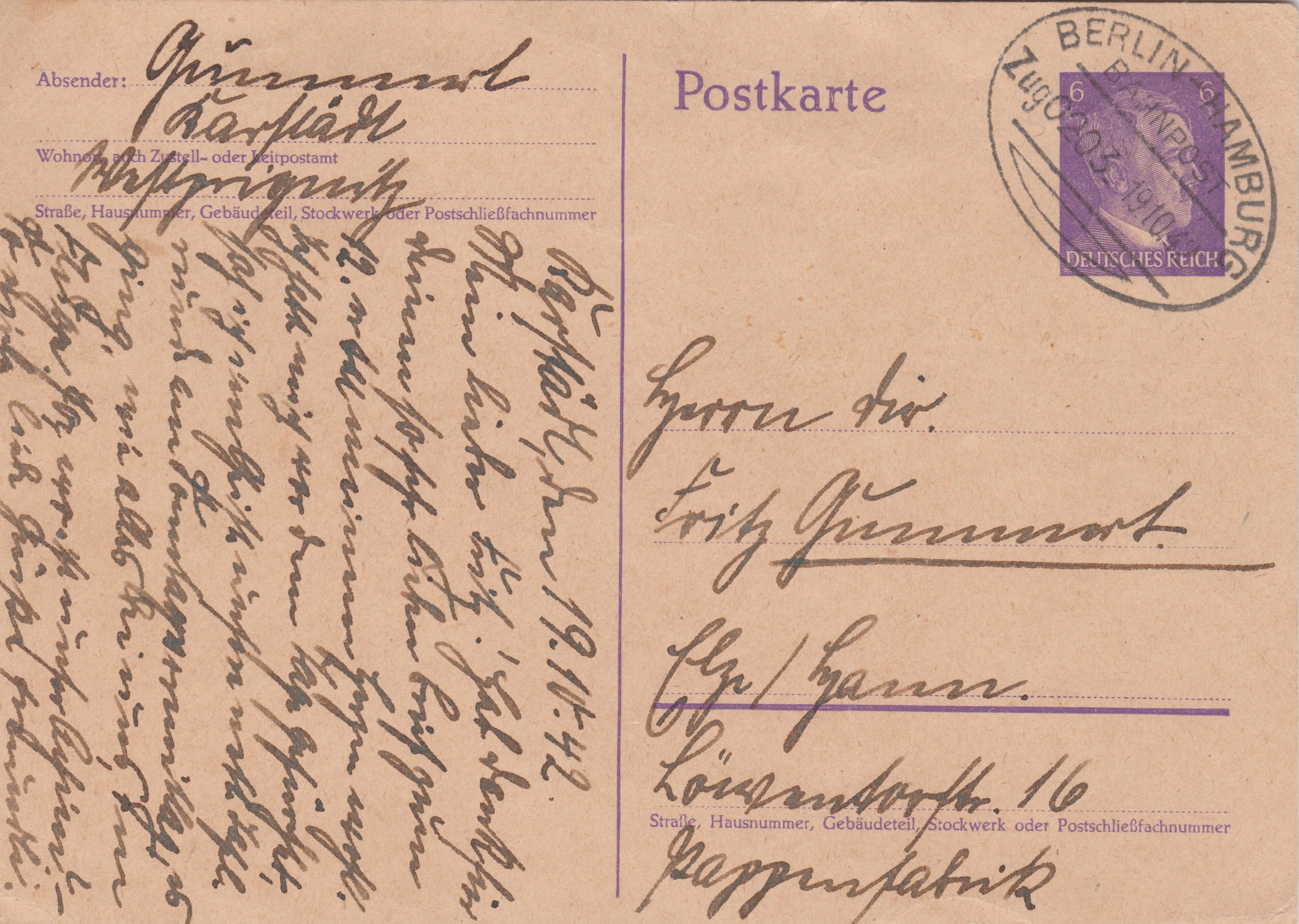 Deutsches Reich Ganzsache 6 Pf Dauerserie Adolf Hitler am 19.10.1942 mit Bahnpoststempel "BERLIN-HAMBURG ZUG 0203":