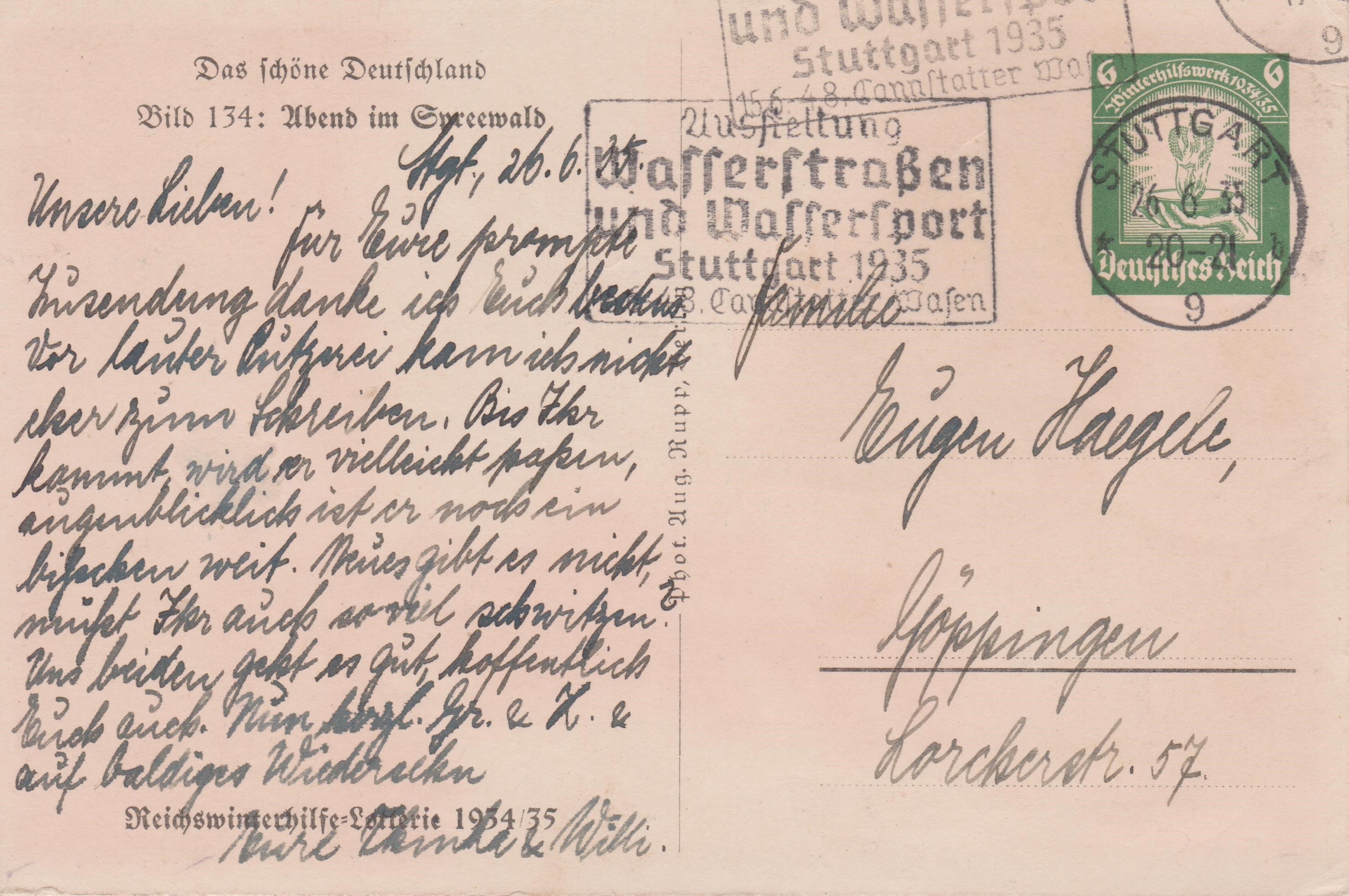Hier ein Exemplar mit Wertstempel und "Bild 134: Abend im Spreewald", gebraucht am 26.06.1935 in STUTTGART: