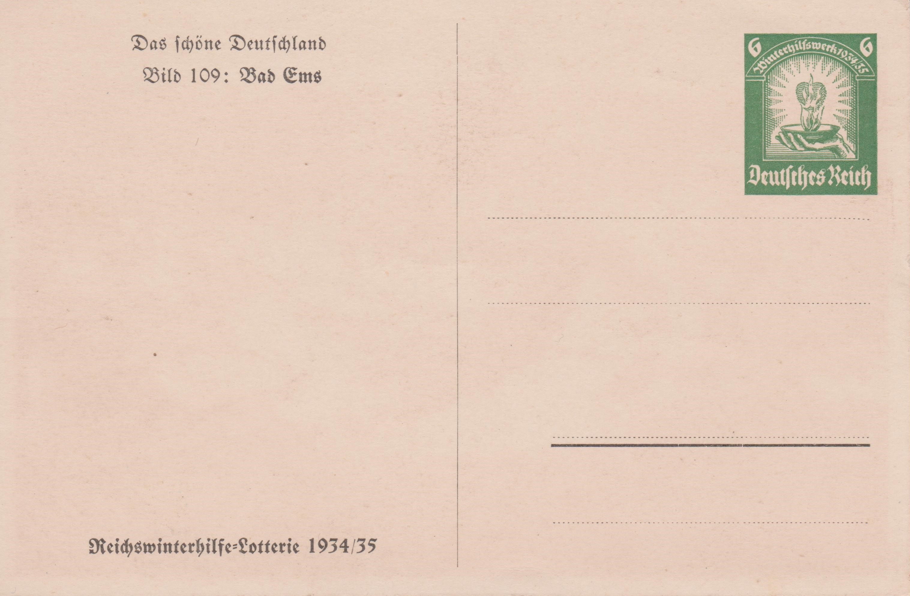 Ganzsache Deutsches Reich P 254 Bild 109 "Bad Ems", abgetrennte Einzelkarte aus bei der "Reichswinterhilfe-Lotterie 1934/35":