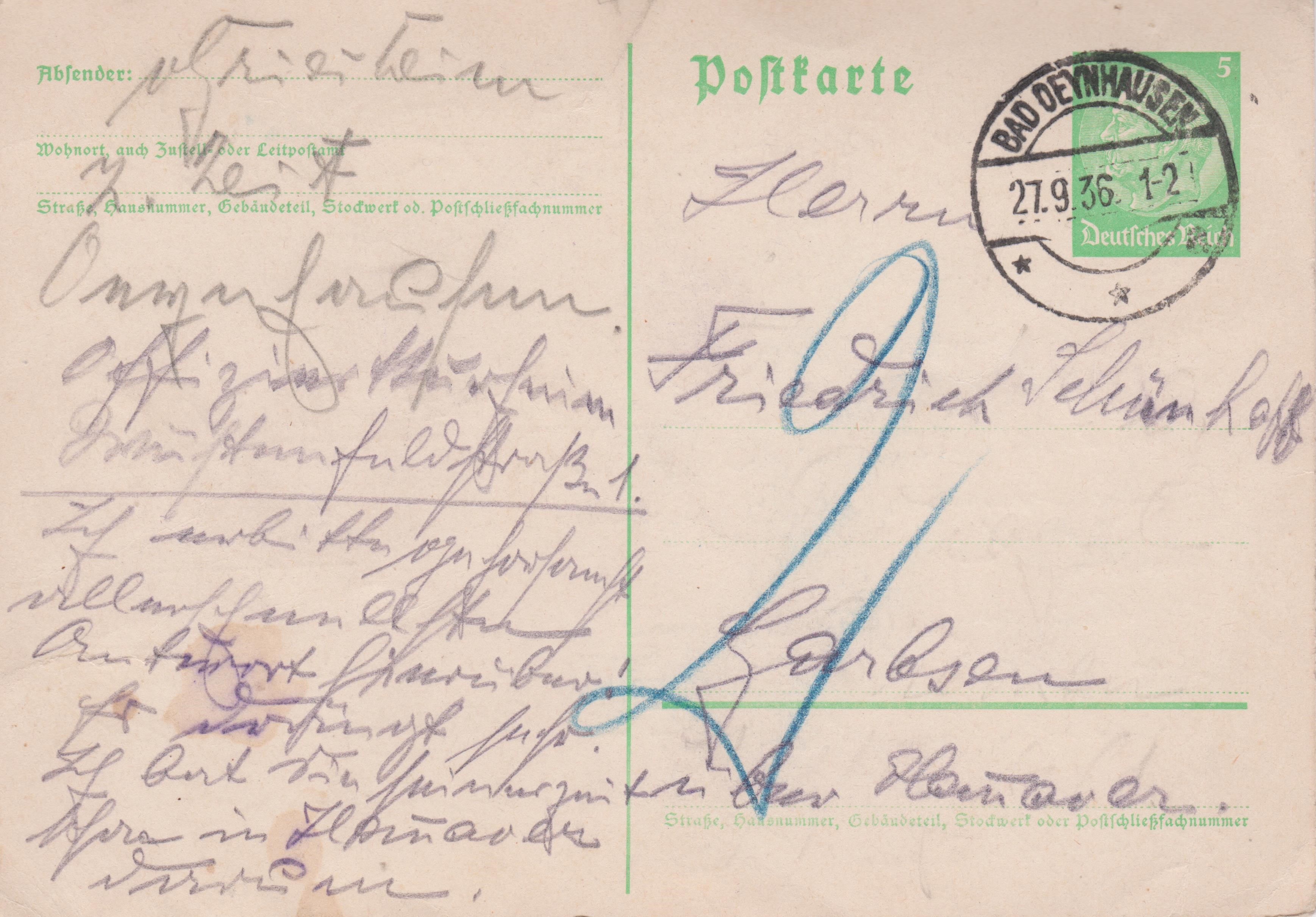 Auch diese Ganzsache 5 Pf Dauerserie Hindenburg wurde von BAD OEYNHAUSEN nach "Garbsen", also im Fernverkehr benutzt und daher ebenfalls mit 2 Pf Nachgebühr belegt:
