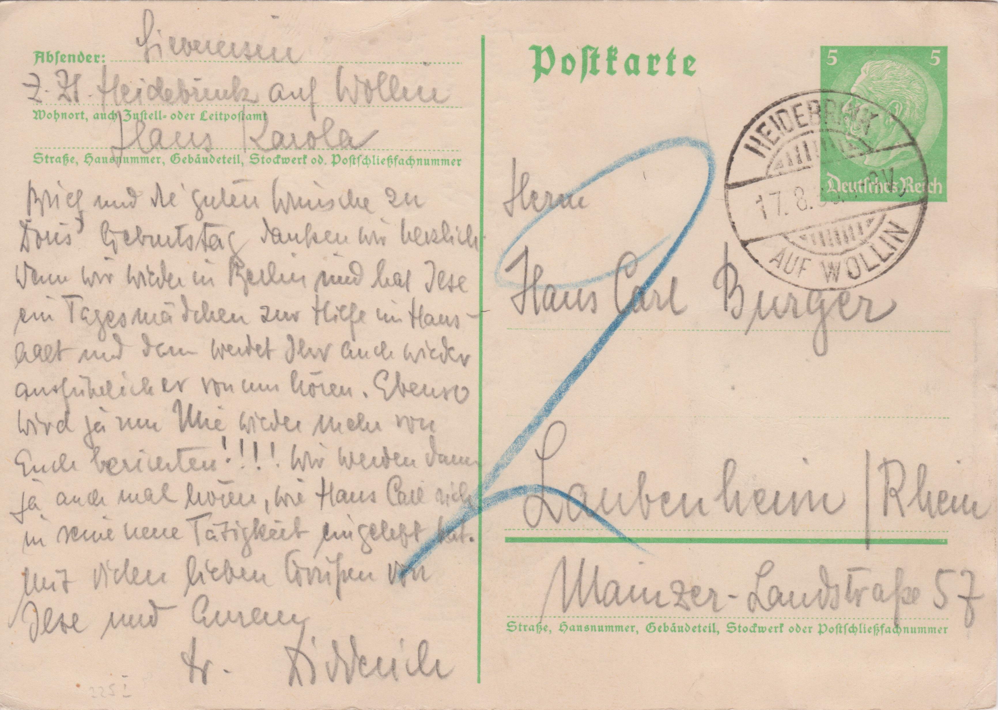 Diese Ganzsache 5 Pf Dauerserie Hindenburg wurde von HEIDEBRINK AUF WOLLIN nach "Laubenheim/Rhein", also im Fernverkehr benutzt und daher ebenfalls mit 2 Pf Nachgebühr belegt: