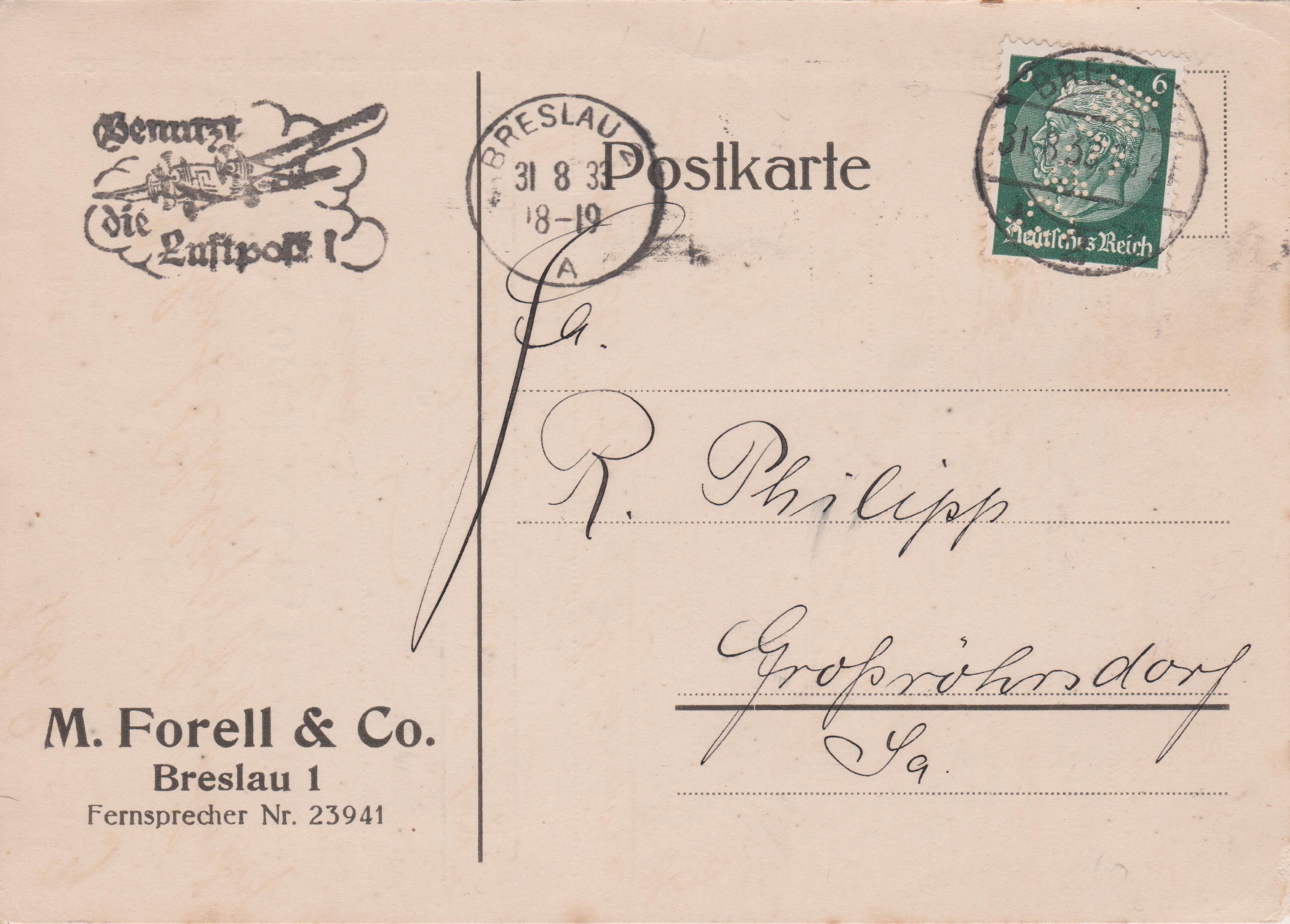 Einzelfrankatur 6 P Dauerserie Hindenburg Medaillon mit Firmenlochung M.F.&Co, adressiert nach "Großröhrsdorf", aufgegeben in Breslau: