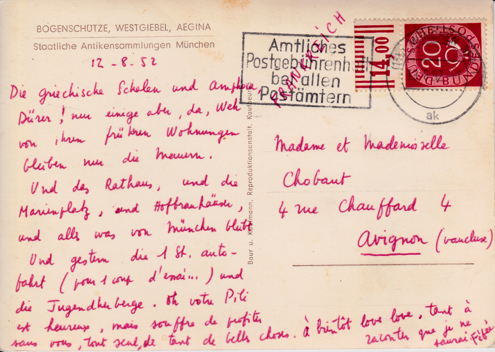 Eine Auslandspostkarte kostete von 7.7.1949 3.3.1966 20Pf. Diese Postkarte vom 13.8.1952 von München nach Avignon (Frankreich) wurde mit einer Marke der Posthornserie zu 20Pf vom Oberrand frankiert.