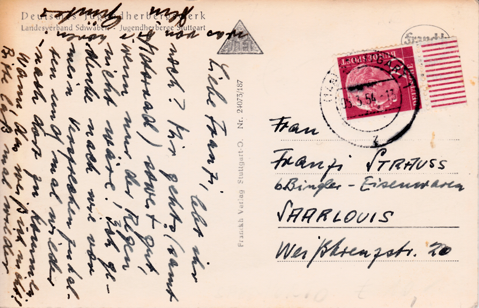 Postkarte von Stuttgart nach Saarlouis vom 5.3.1954 frankiert mit einer Marke zu 20Pf vom unteren Bogenrand der DS Heuss. Die Karte ist portorichtig als Auslandspostkarte frankiert (Saarland gehörte 1954 nicht zu Deutschland!).