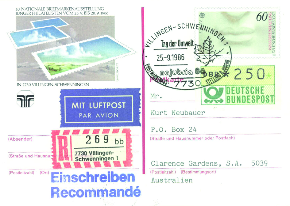 Eine Auslandspostkarte kostete von 1.7.1982 30.3.1989 70Pf. Diese Sonderpostkarte mit dem Wertzeicheneindruck der 60Pf Europamarke 1986 (MiNr PSo 13) zur NAJUBRIA '86 in Villingen-Schwenningen wurde als Einschreiben mit Luftpost nach Australien mit dem Sonderstempel zur NAJUBRIA 1986 "Tag der Umwelt" verschickt. Das Porto betrug für eine Auslandspostkarte 70, für Einschreiben 200Pf und Luftpost Zone 4 40Pf, daher war zusätzlich zum Wertstempel ein Automatenmarke zu 250Pf notwendig.