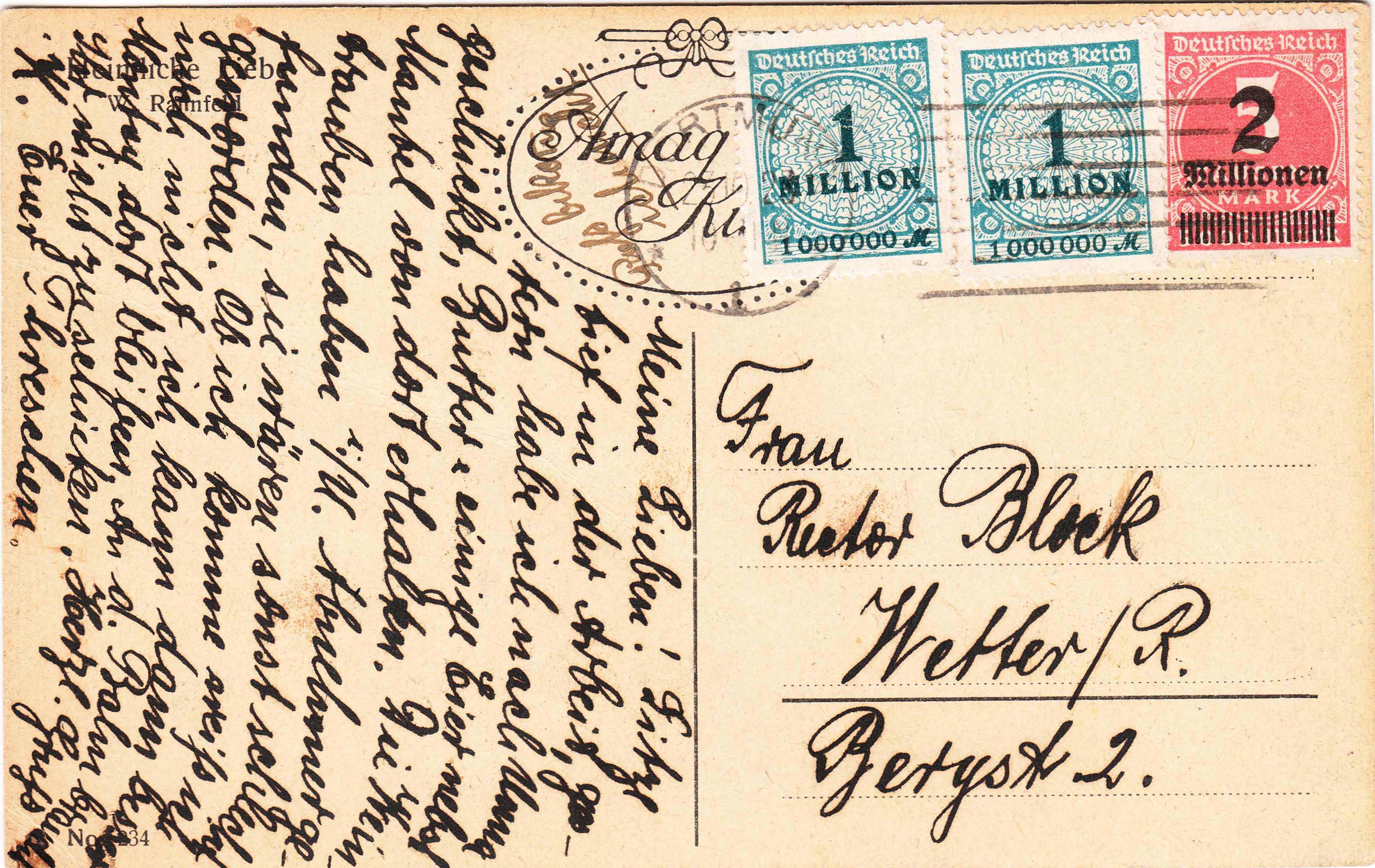 Vom 20.10.1923 bis zum 31.10.1923 betrug das Porto für Postkarten im Fernverkehr 4 Millionen Mark!