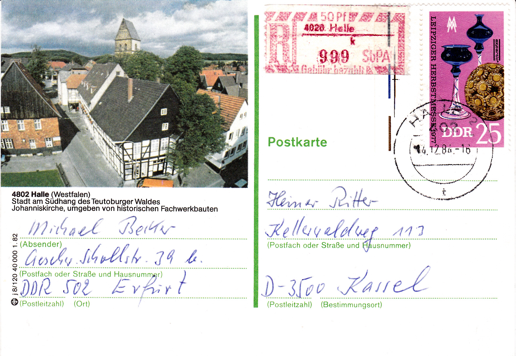 Hier wurde bei einer Bildpostkarte "Halle(Westfalen) der Deutschen Bundespost der Wertstempel mit einer Marke zu 25Pf (Leipziger Messe MiNr 2251) überklebt und bei einem Selbstbedienungspostamt in Halle an der Saale nach Kassel verschickt.