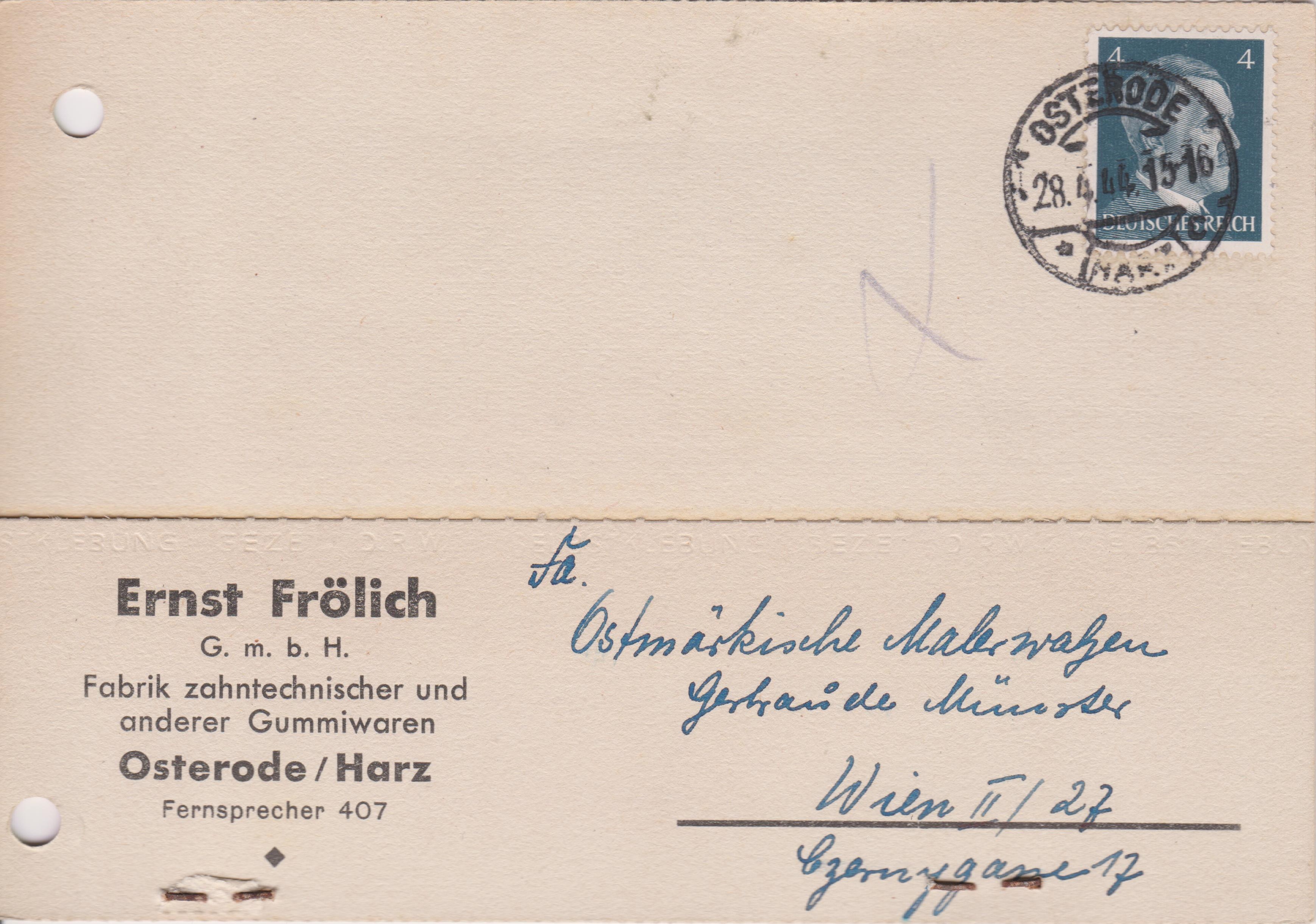 Drucksache in Kartenform, adressiert nach "Wien II/27", frankiert per Einzelfrankatur 4 Pf Dauerserie Adolf Hitler, mit Tagesstempel OSTERODE vom 28.04.1944: