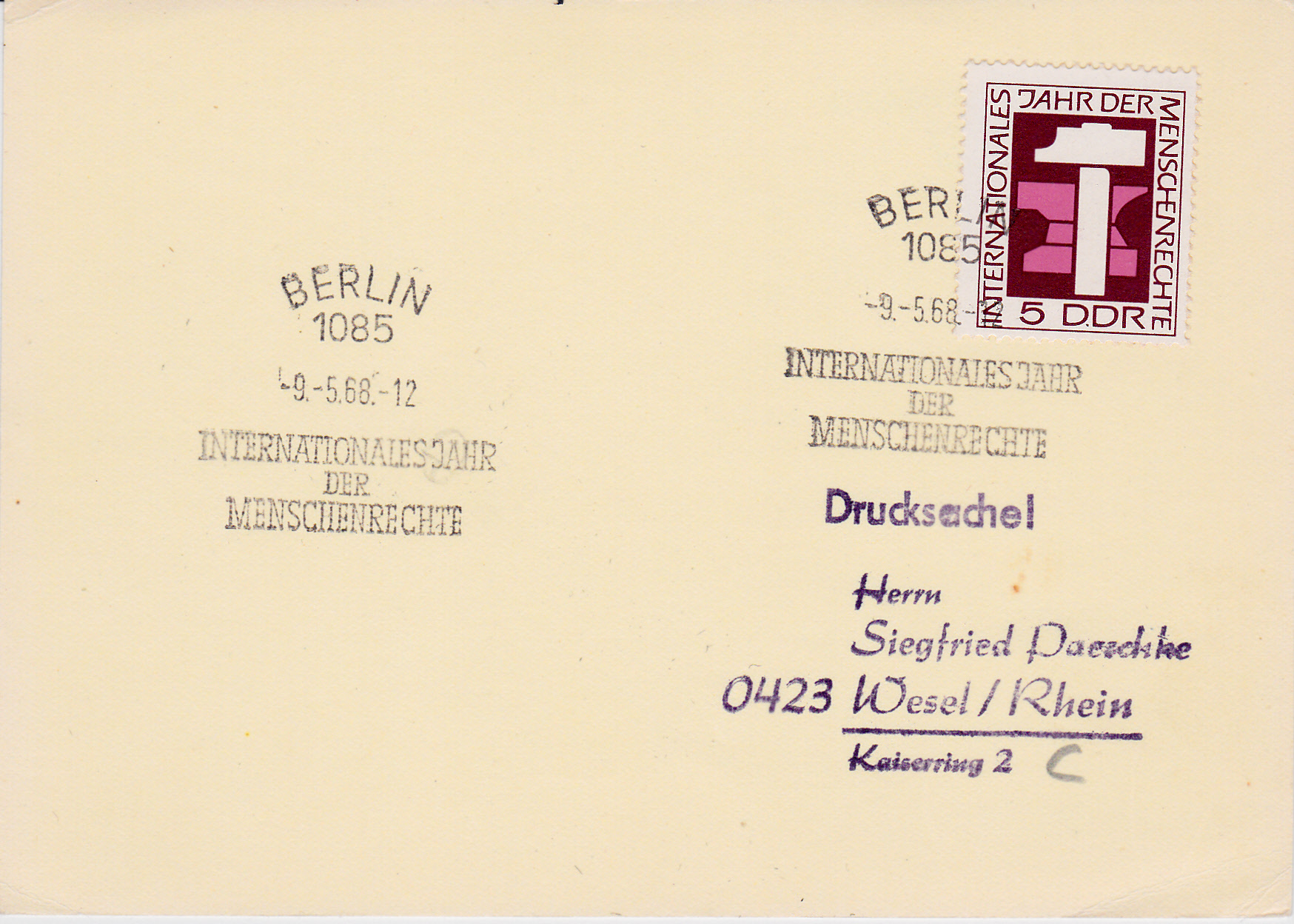 Diese Drucksache wurde am 9.5.1968 mit einem Sonderstempel zu Internationalen Jahr der Menschenrechte passend zu der 5Pf-Marke (MiNr 1368) versehen zum Versand gebracht.