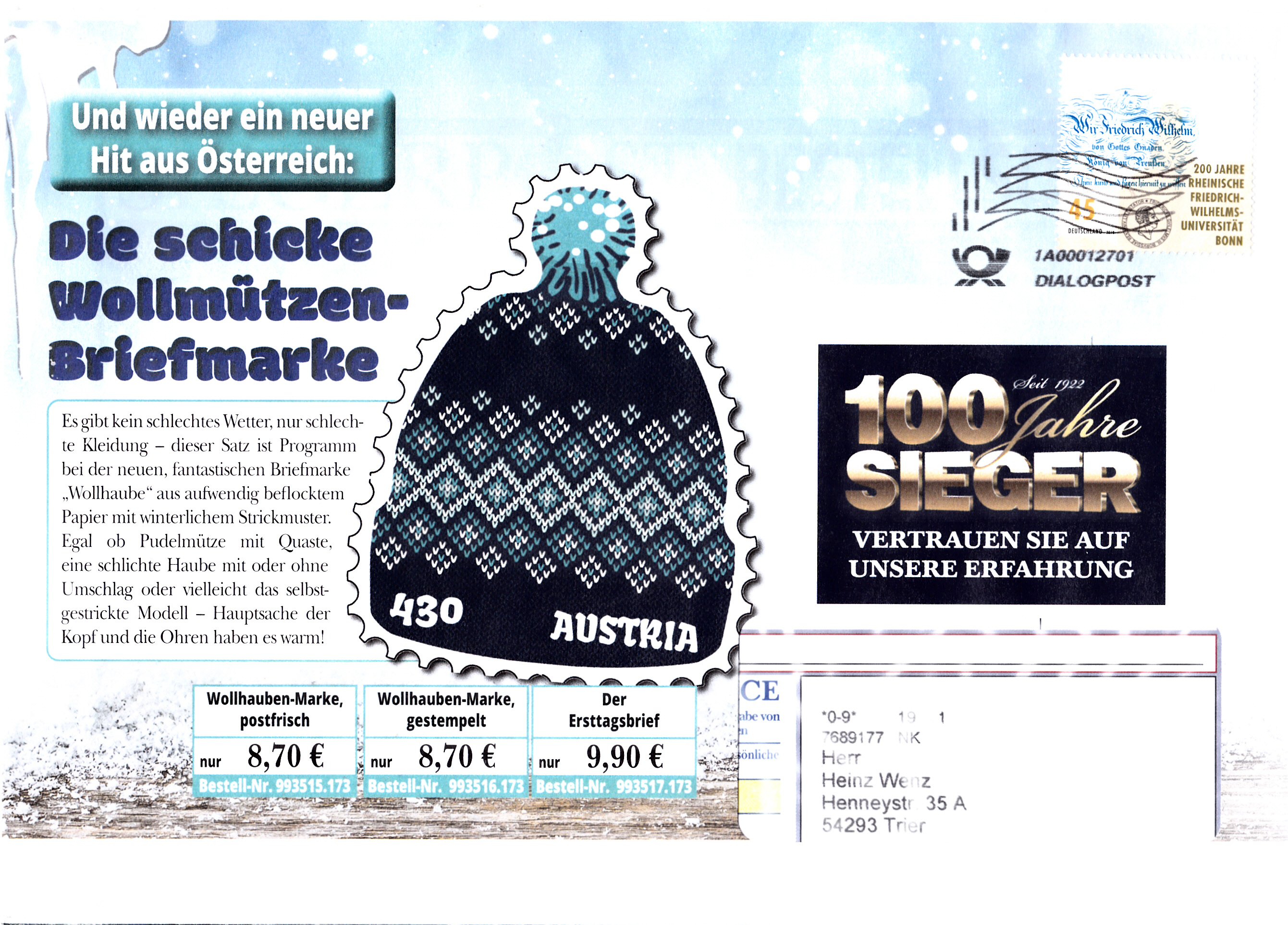 Dialogpost von Mitte Februar 2022 frankiert mit einer Marke zu 45 Cent (MiNr 3360) "200 Jahre Rheinische Friedrich-Wilhelms-Universität Bonn".