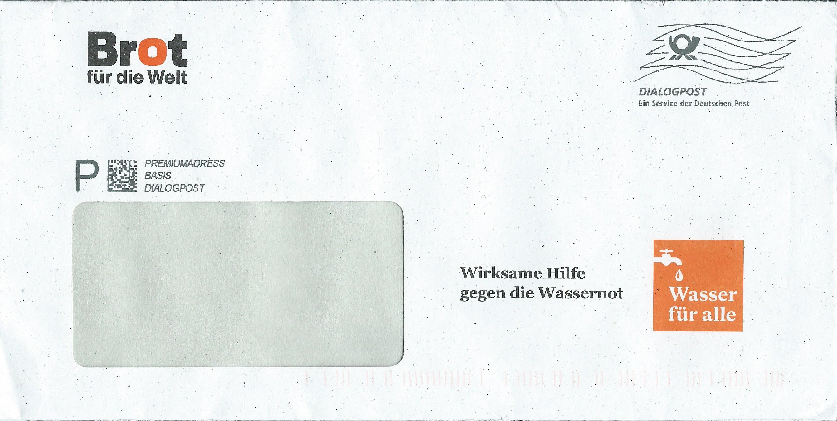 ein Neuzugang der Dialogpost: Absender ist Brot für die Welt. Es ist kein „Wertstempel“ vorhanden, nur die übliche Frankierwelle mit dem bekannten Text.
