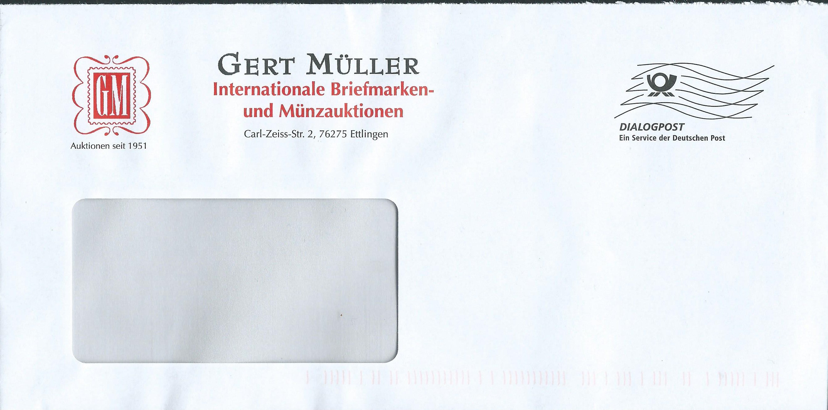 heute frisch aus dem eigenen Briefkasten gezogen: Dialogpost vom Auktionshaus Gert Müller. Hier auch wieder nur eine Frankierwelle mit dem mehr als bekannten Text: