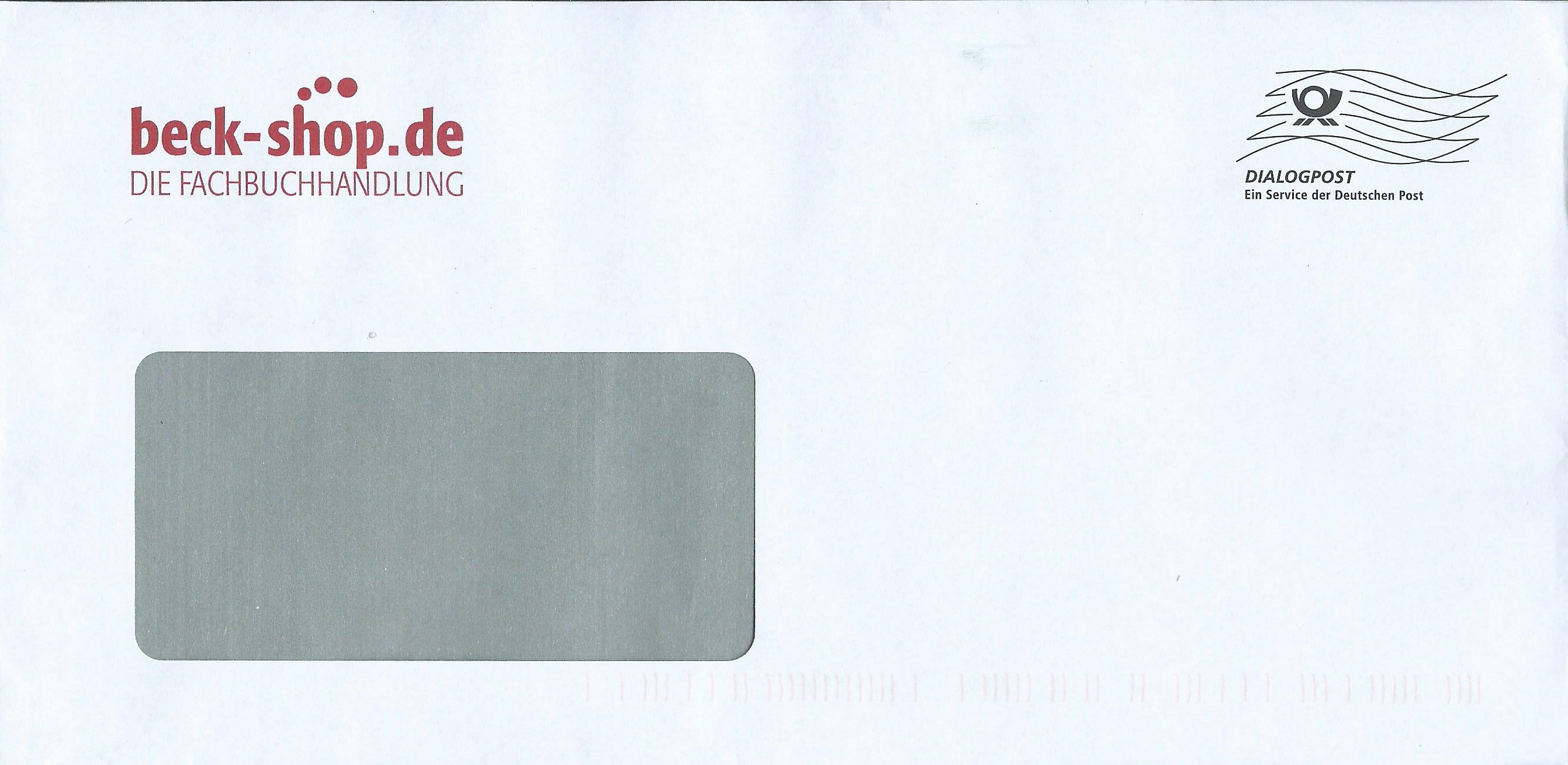 es sind mir 3 neue Belege in die Hände gefallen, die hier gleich vorgestellt werden sollen. Der erste stammt vom beck-shop.de und hat nur die Frankierwelle mit dem Text „Dialogpost Ein Service der Deutschen Post“ ohne angedeuteten Wertstempel.