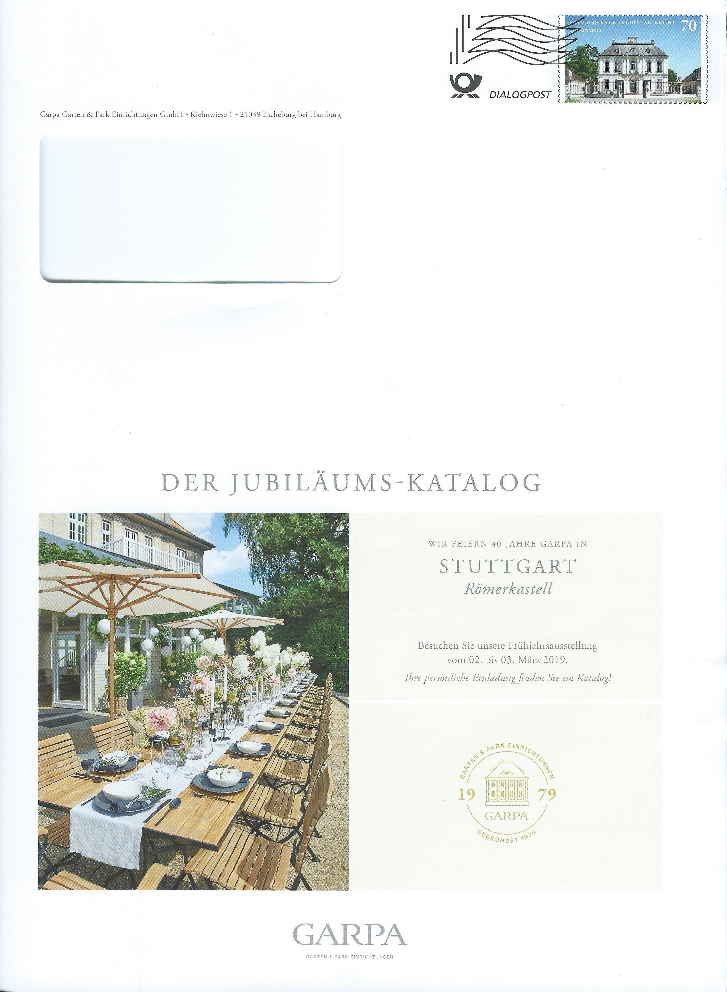 Und der dritte im Bunde ist ein für mich ganz besonderer: Er hat als Wertstempel die Marke zu 70 ct Schloss Falkenlust zu Brühl und die obligatorische Frankierwelle. Das ganze ist ein „Einlegeteil“ in einer großen Werbesendung (Kataloge) gewesen und hat DIN A 4-Format. Witzig finde ich auch die angedeuteten Fluoreszenz-Balken links und rechts neben der „Marke“, die leuchten nicht und sind irgendwie auch überflüssig.