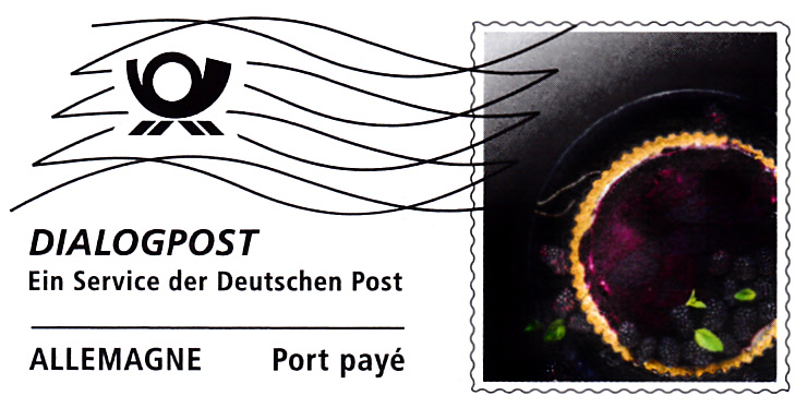 Dialogpost des Edeka-Center Trier mit einem Wertstempelähnlichen Zudruck mit dem Motiv "Brombeer Tarte".