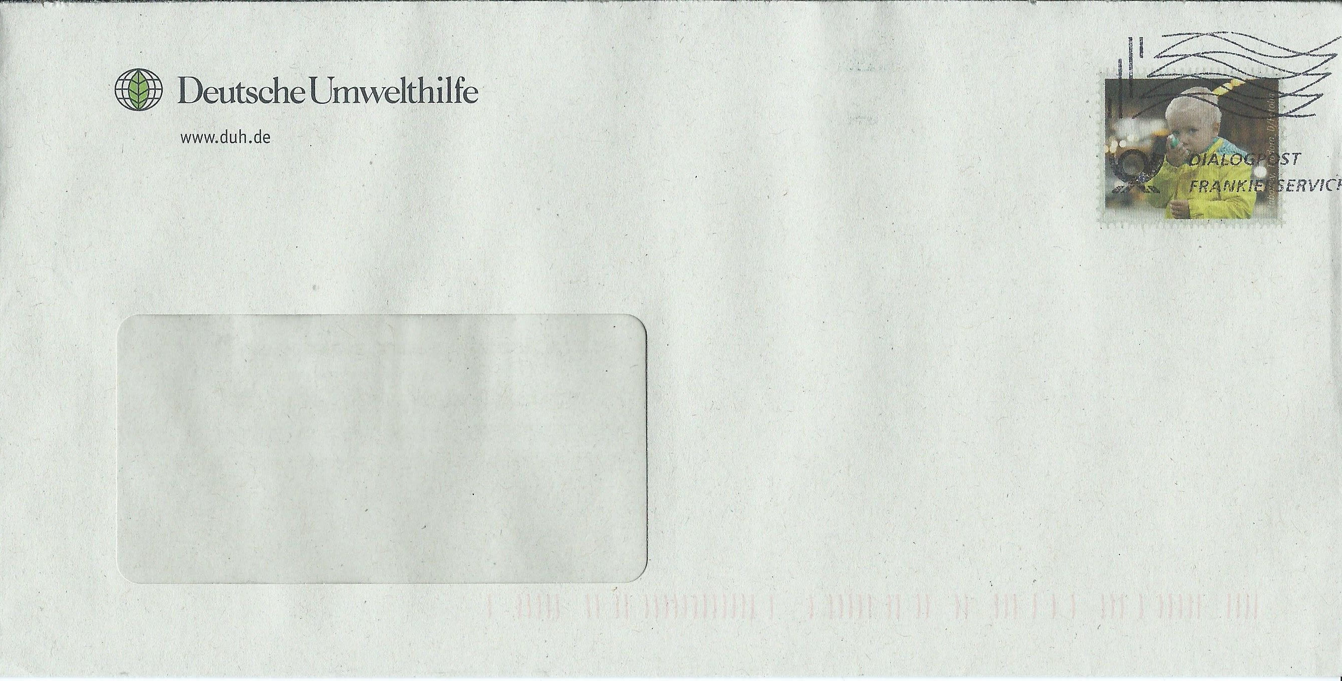 Dazu gesellt sich die Deutsche Umwelthilfe, hier ist unter der Frankierwelle noch ein markenähnlicher Zudruck mit einem Motiv Kind zu sehen: