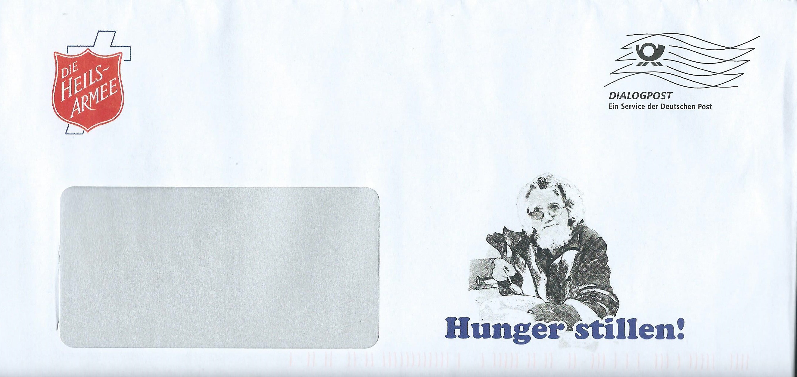 Und als dritter im Bunde ein Beleg der Heilsarmee „Hunger stillen“, hier wieder nur die Frankierwelle.